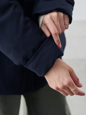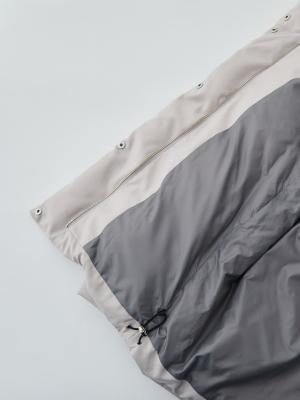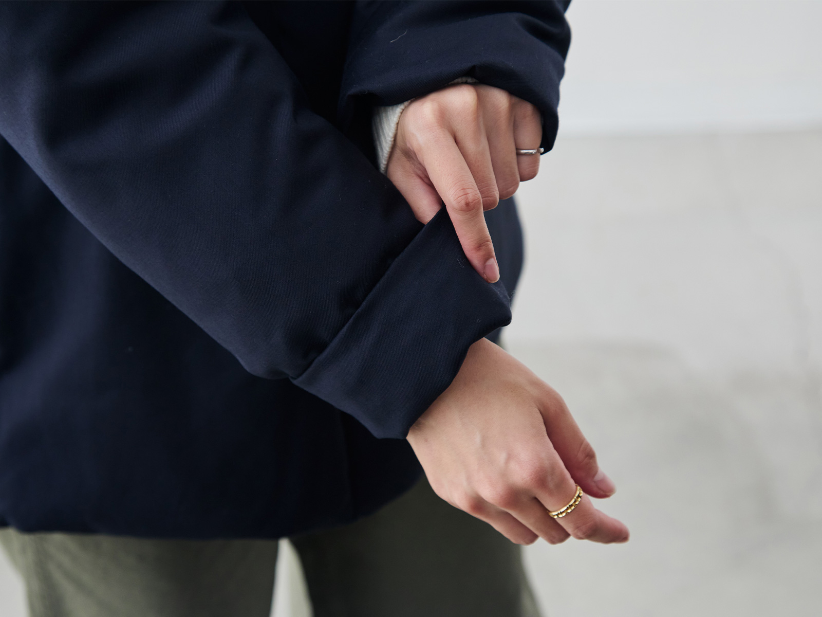 両サイドの裾にはこのようなアジャスターがついていて、とっても簡単にシルエットチェンジが楽しめるんです。裾を絞ることで保温性もさらにアップ。