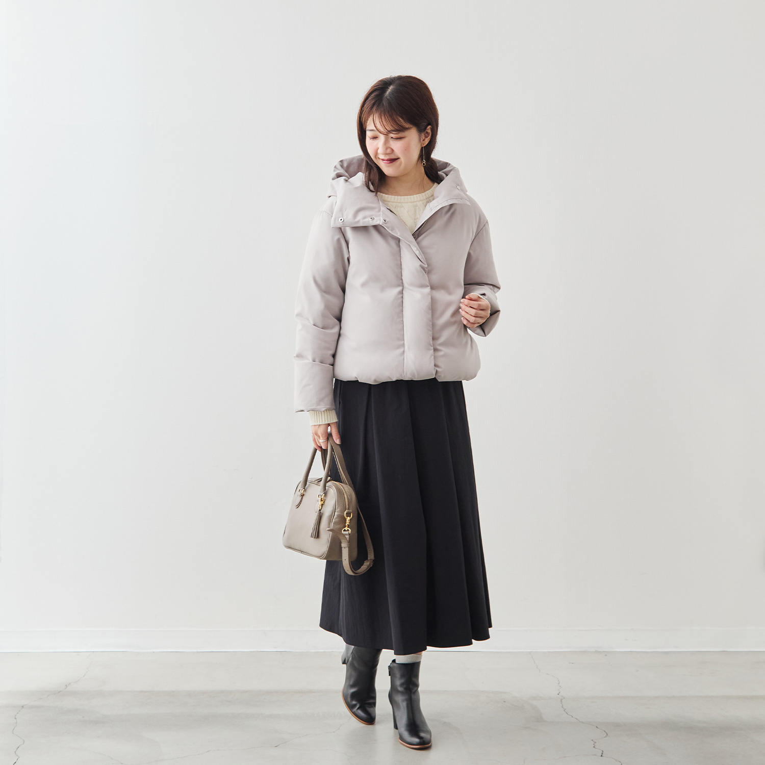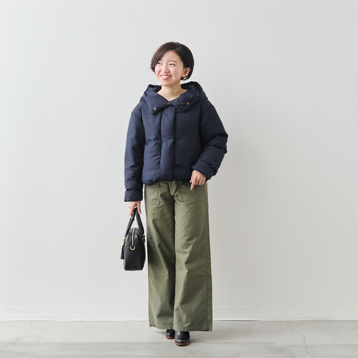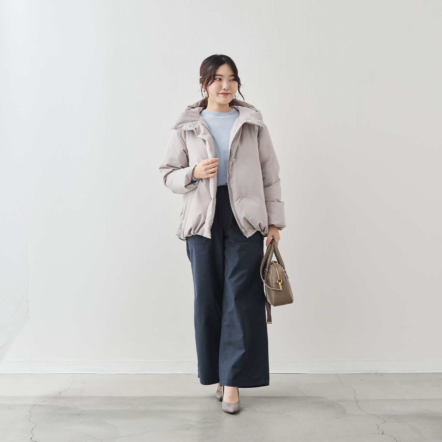 裾を絞ると着丈が短くなり、コロンとした可愛らしいシルエットになります。