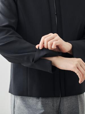 背中側には動きやすさを考えて、適度にストレッチの効いた薄めの芯地を使用。一方、前身頃にはしっかりとした芯地を入れることで、ジャケットらしいハリと、きちんと感のあるシルエットを実現しました。