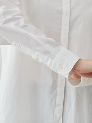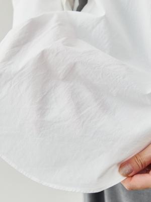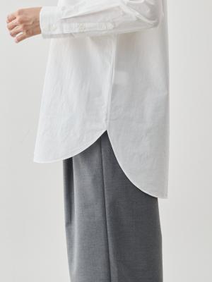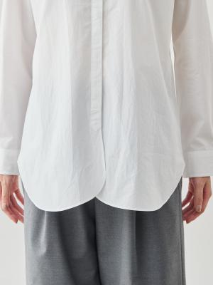 さらに、襟の曲線に合わせて裾やカフスにも丸みをもたせ、全体に統一感のあるデザインに。ベーシックでありながら、どこか“女らしさ”を感じるバランスが魅力です。
