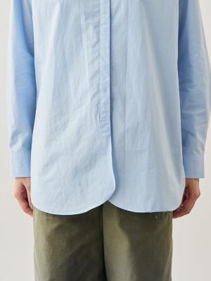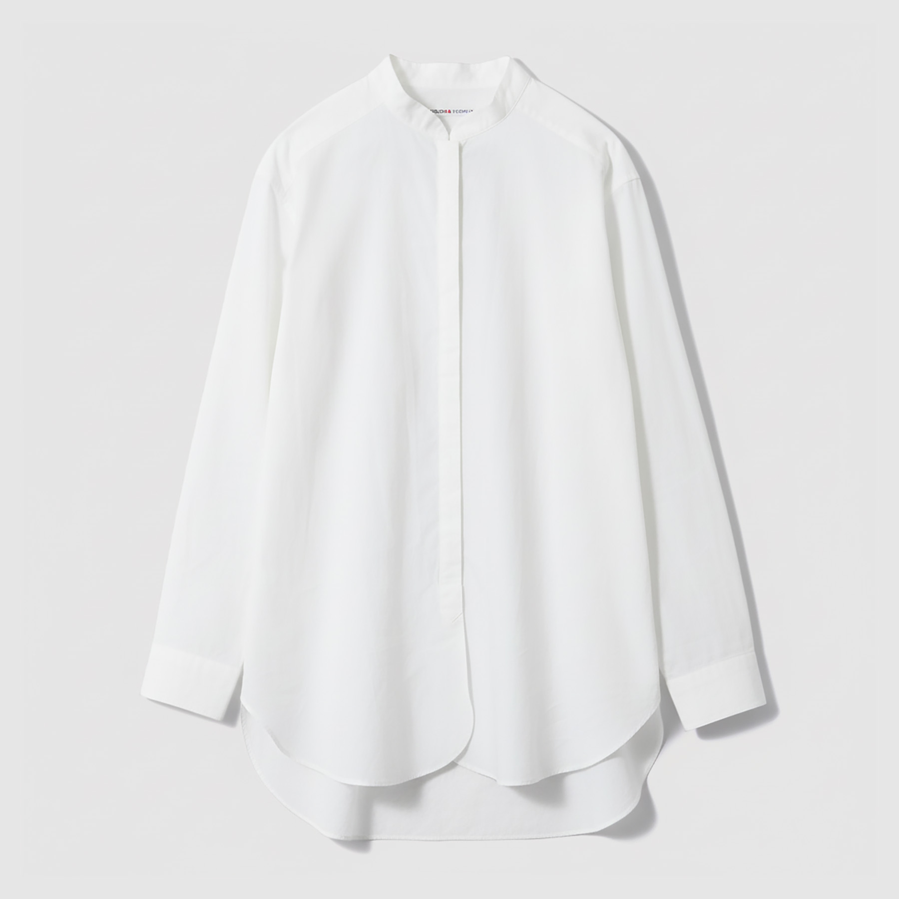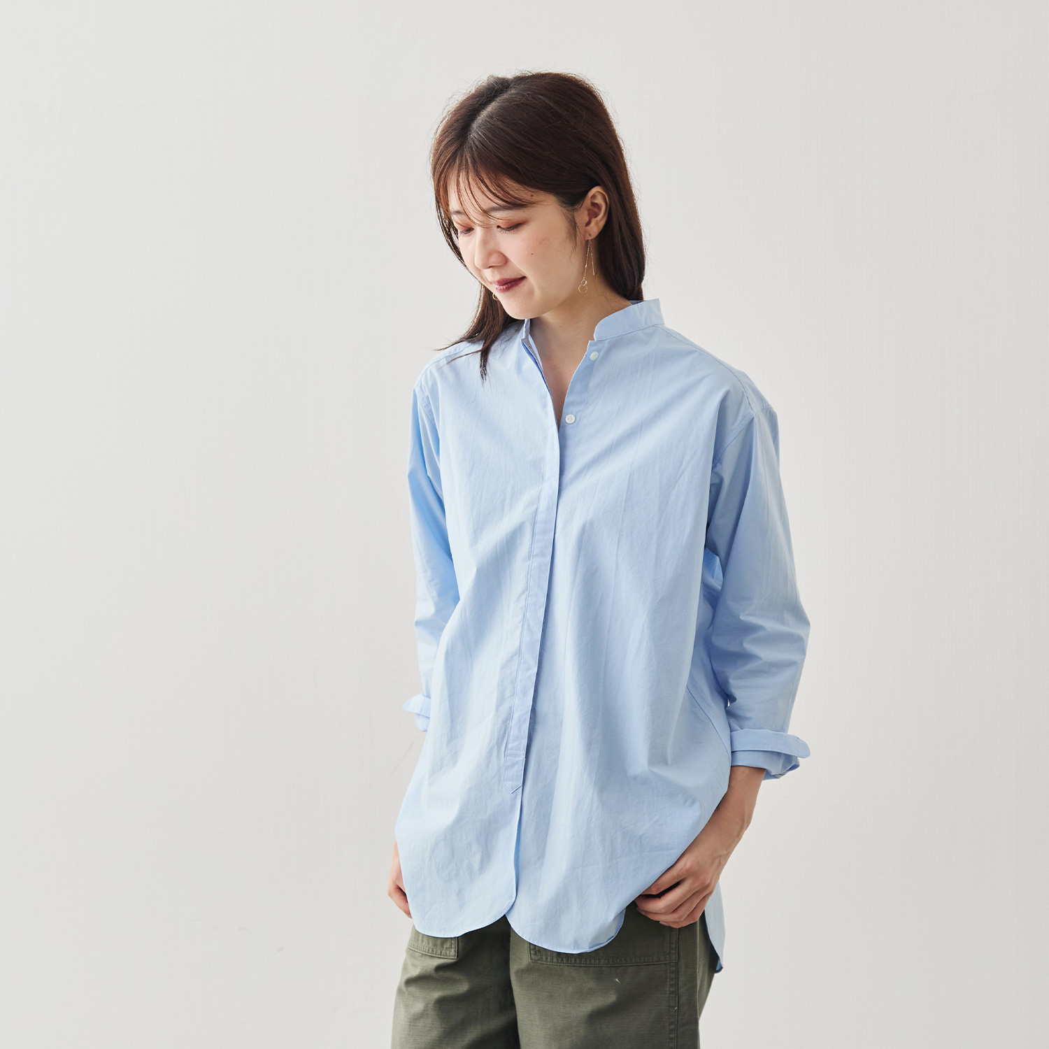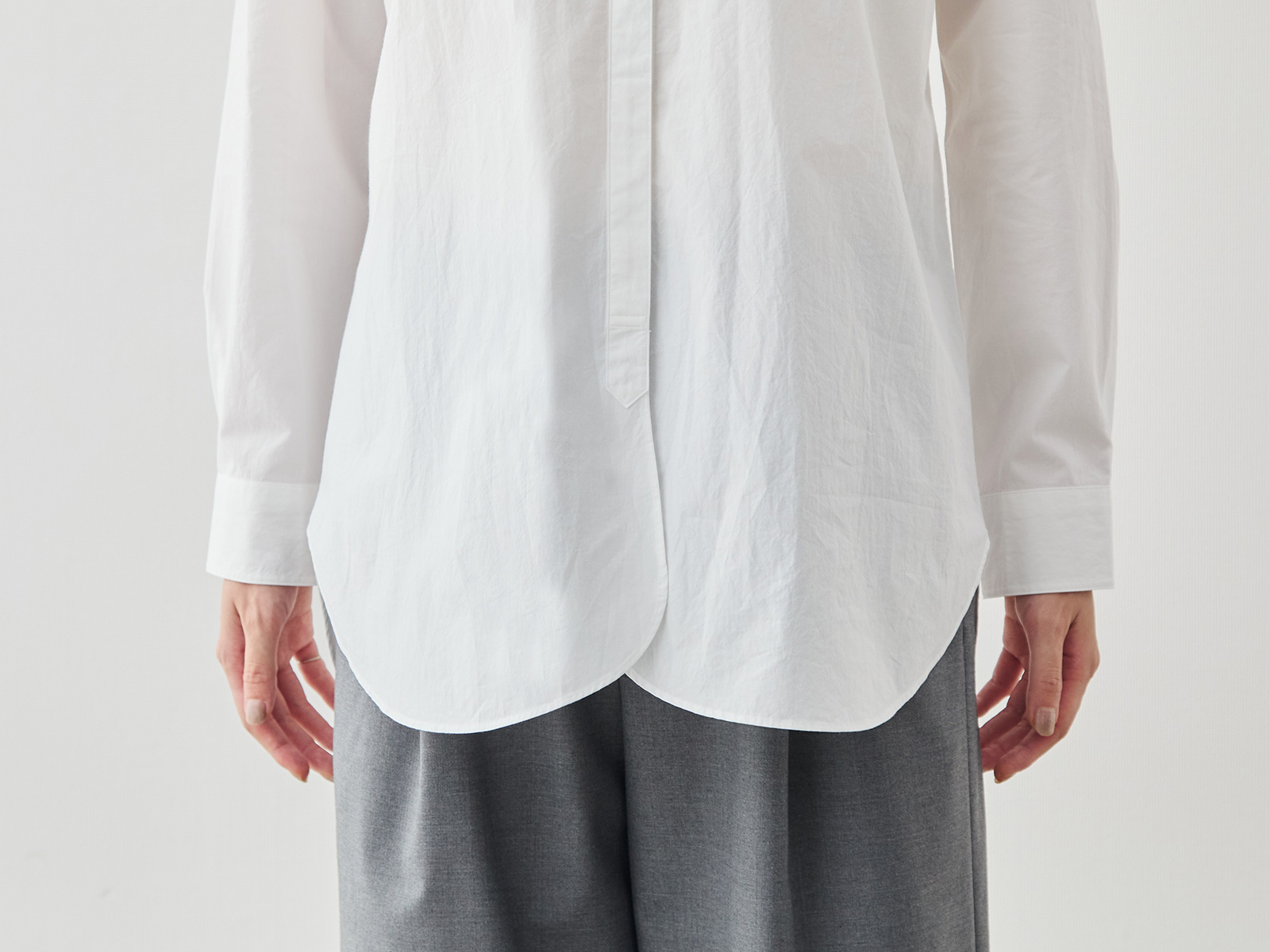 襟の先をやわらかく丸めたバンドカラーが、このシャツのさりげない個性。