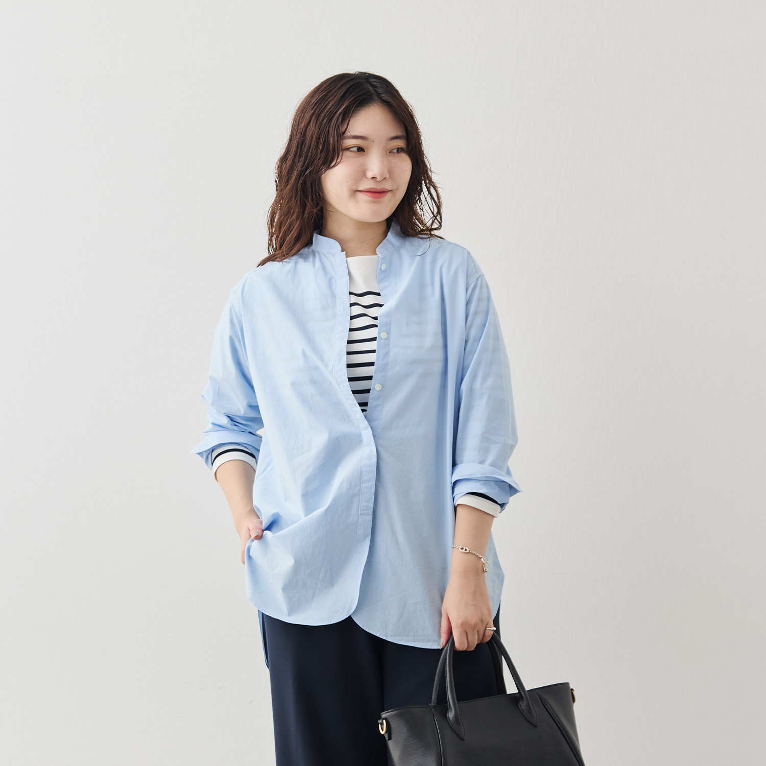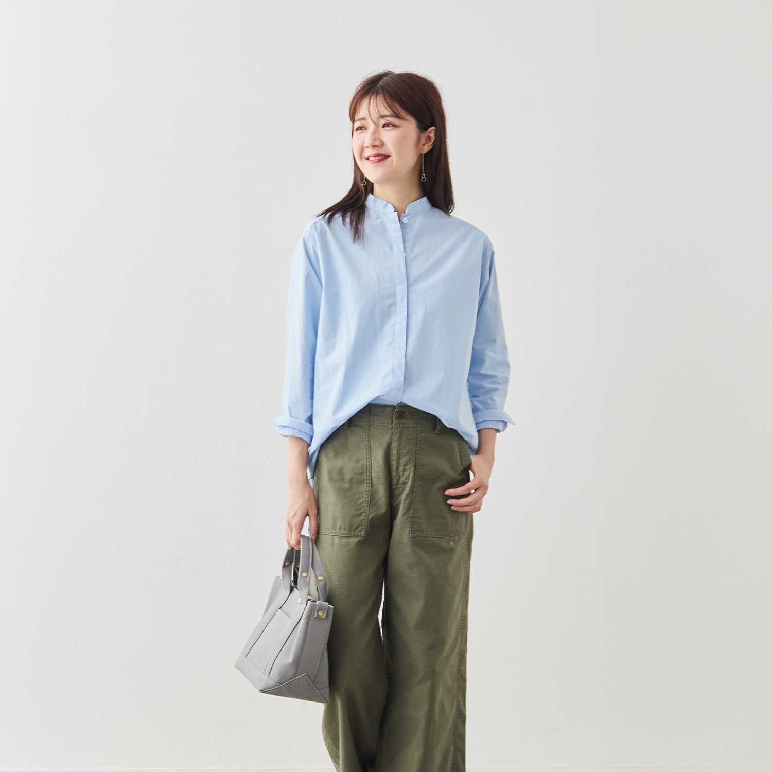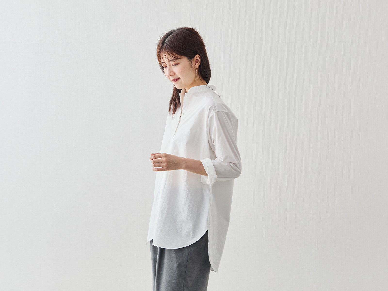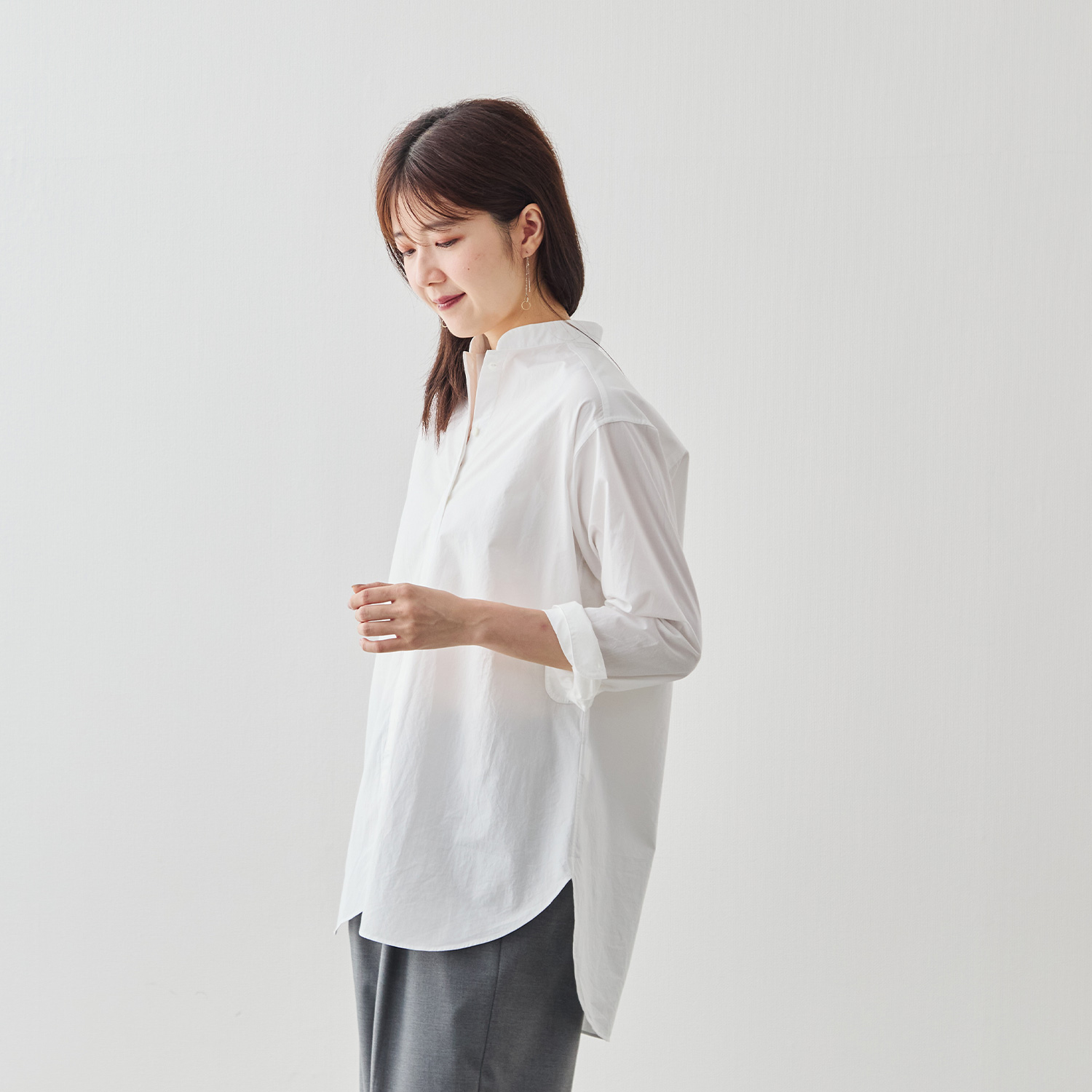 大人の女性に似合う、やわらかな印象を纏ったバンドカラー。