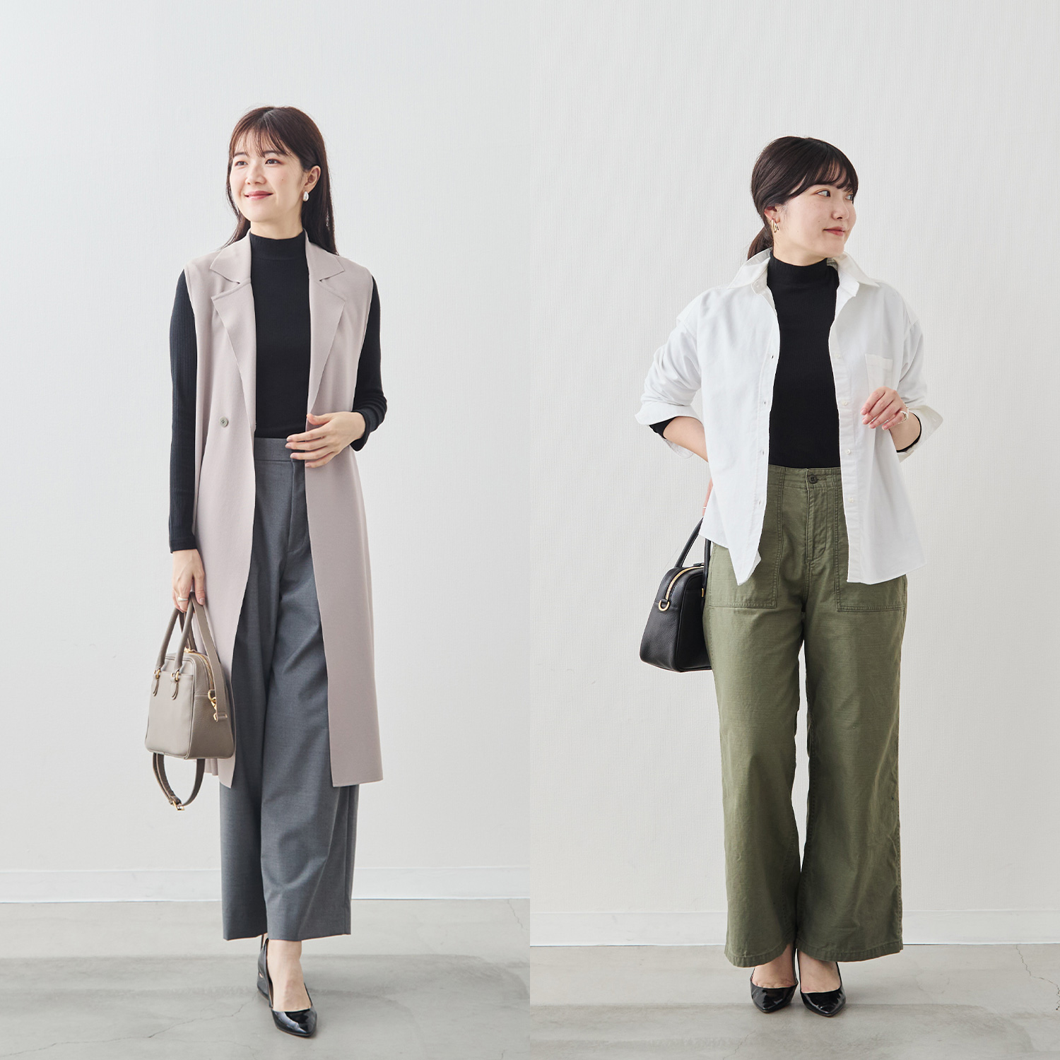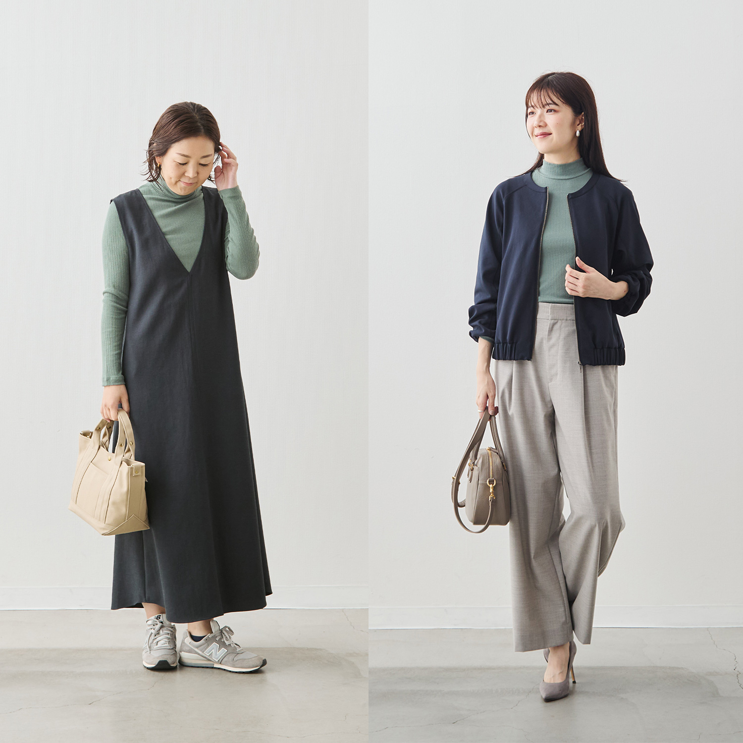 ジャケットやカーディガンのインにはもちろん、ワンピースやシャツの下にもすっと馴染む。差し色にホワイトやグリーンを選べば、コーディネートの幅がぐっと広がります。