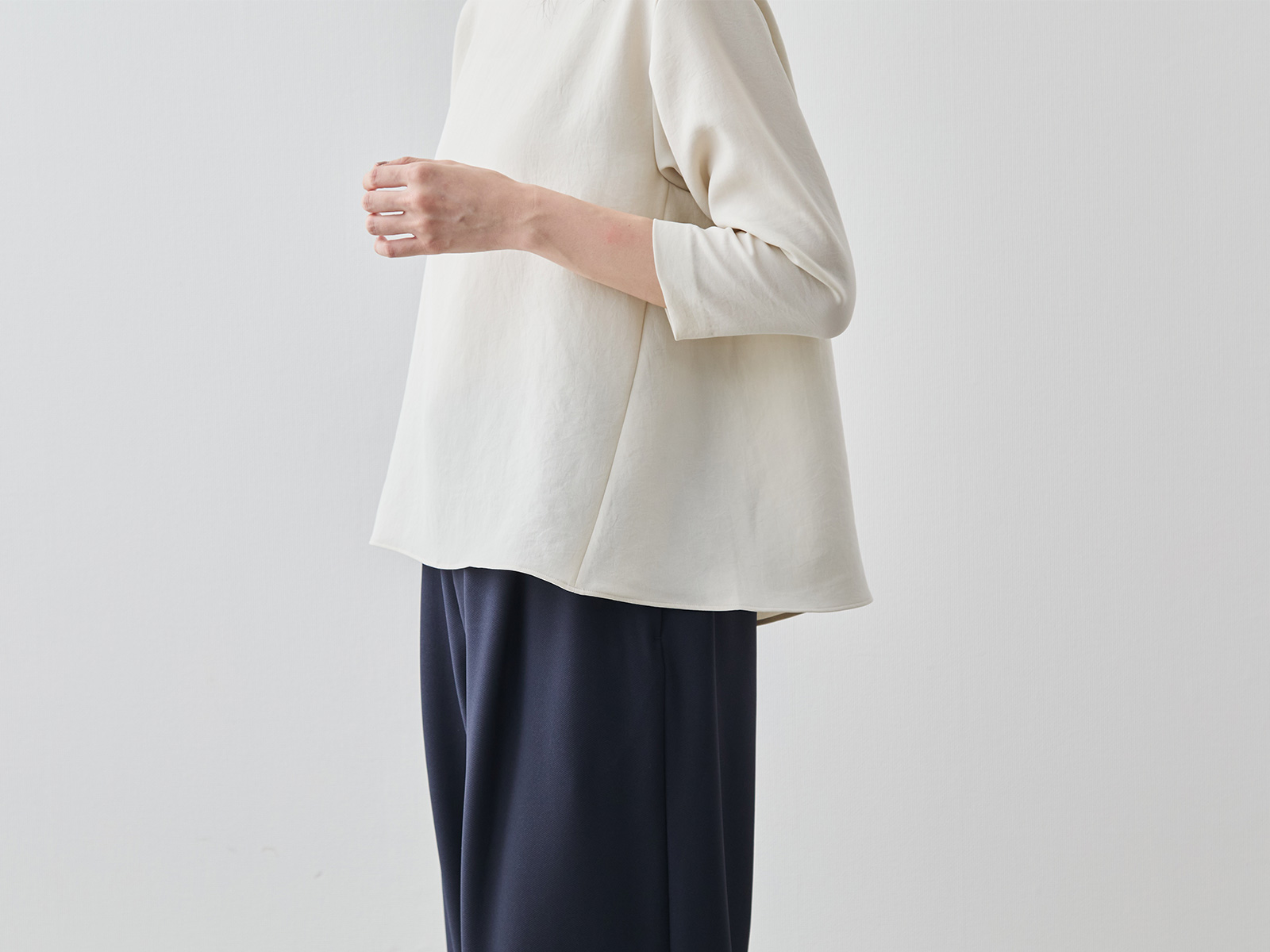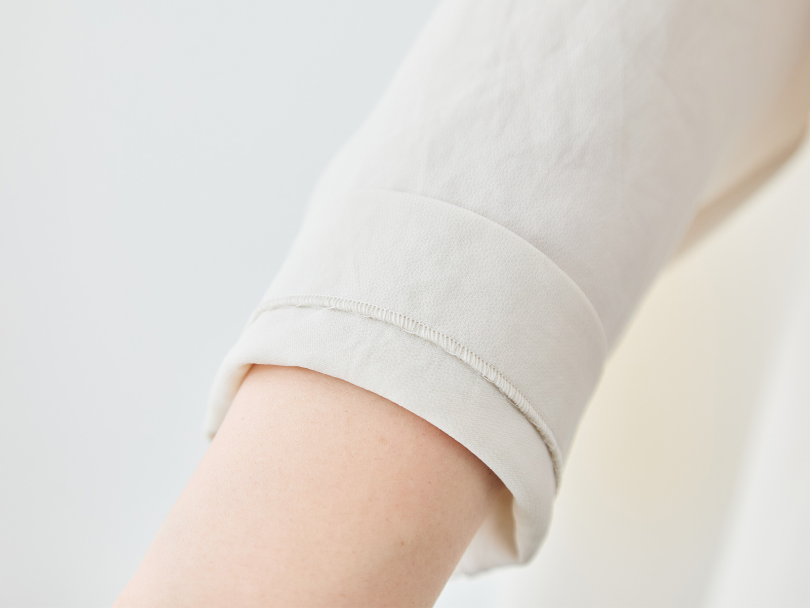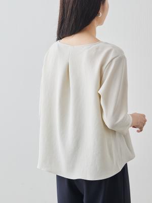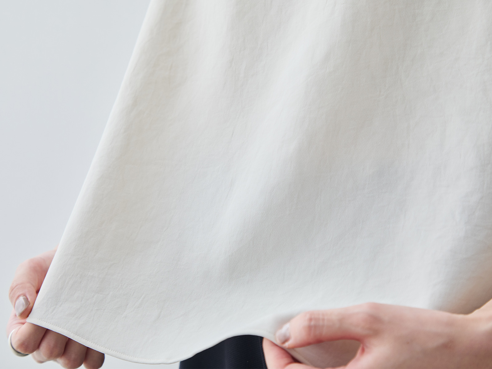 まず「縫製技術」について。例えば「メローロック」を見ていただきたいですね。生地の端がほつれてこないようにミシンで始末することを「ロック」と呼びますが、私たちが得意とするのは、このロック始末の中でも「メローロック」。通常のロック始末よりも幅が狭く、縫い上げるのは簡単ではありません。ですが、マーヤの職人はいとも簡単に1枚の生地を縫い上げます。「Factelier by MARYA」として初めて作った「シルキーサテンストレッチブラウス」もこのメローロックが魅力のひとつ。メローロックをかけることで、縫い幅が細く糸が美しく並ぶので、洋服のドレープ(波打ち)がとてもきれいに出ます。