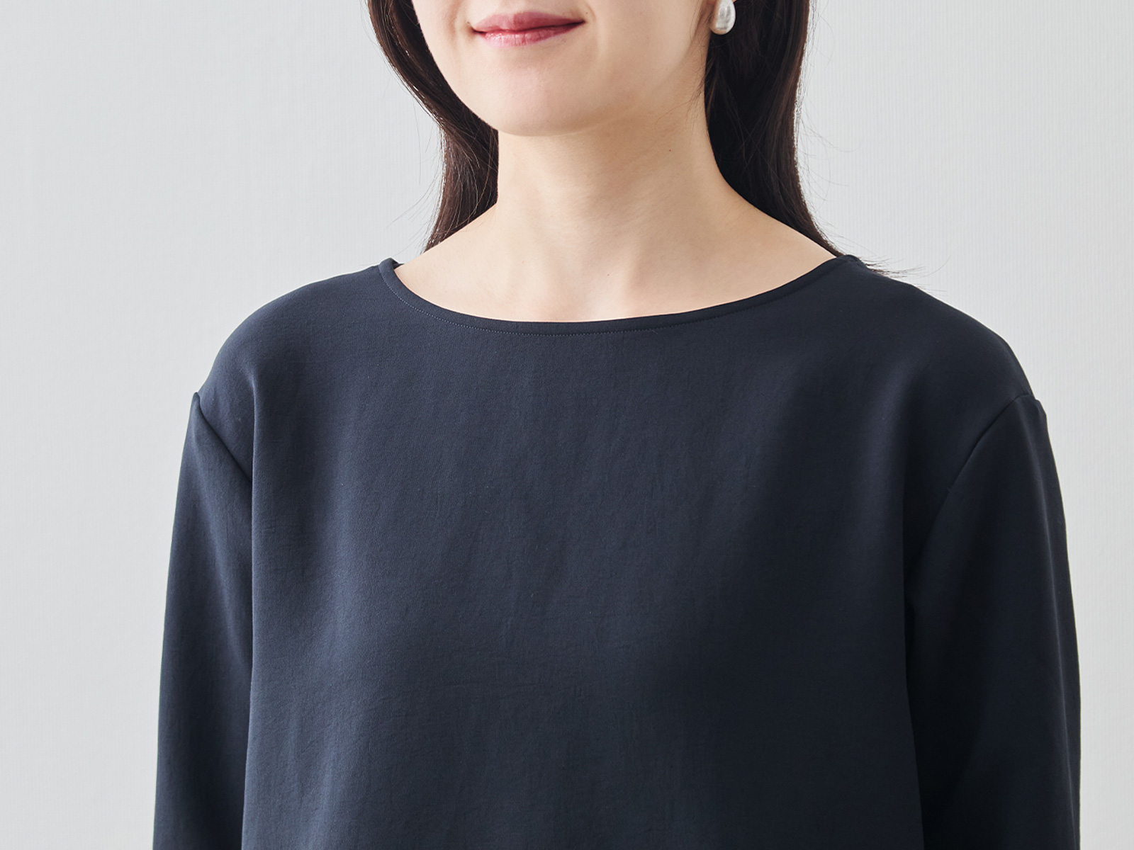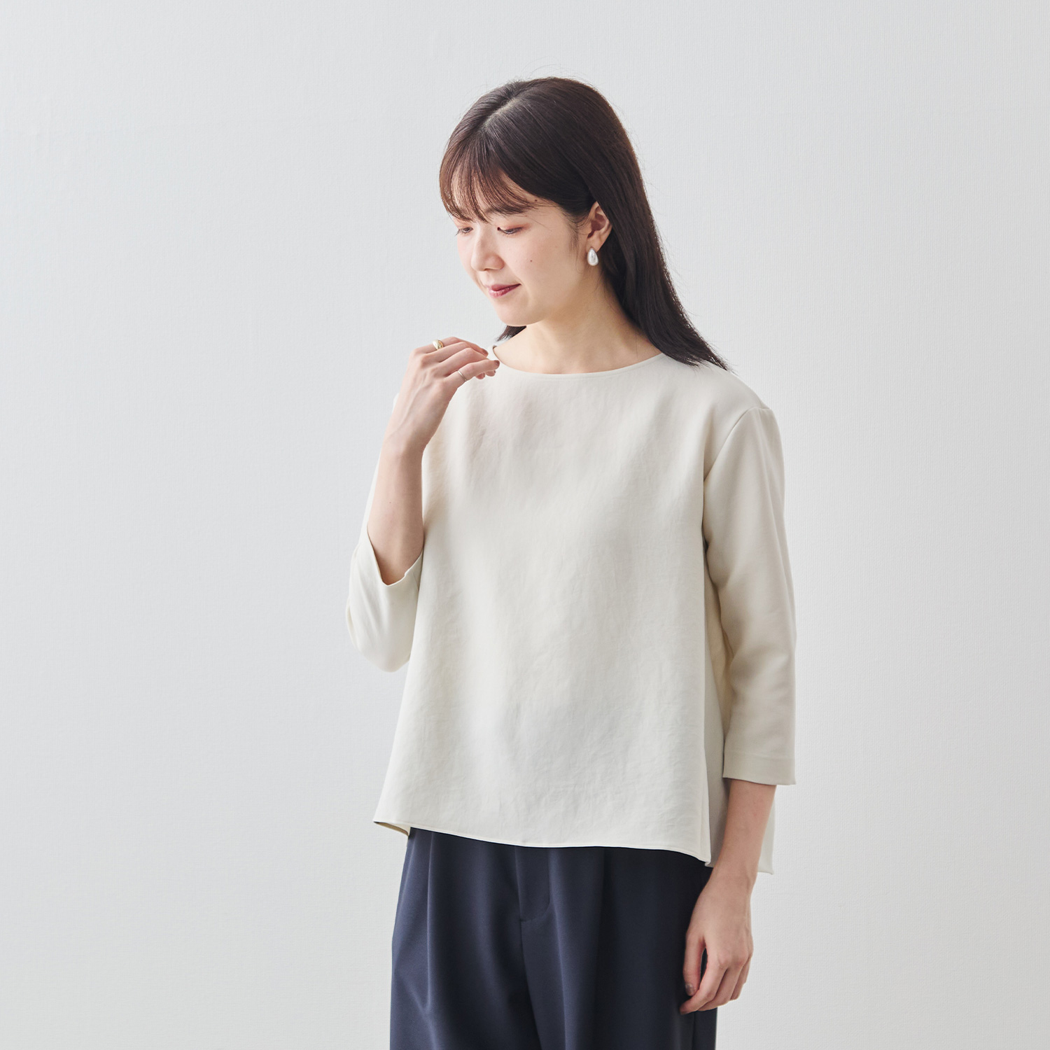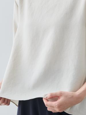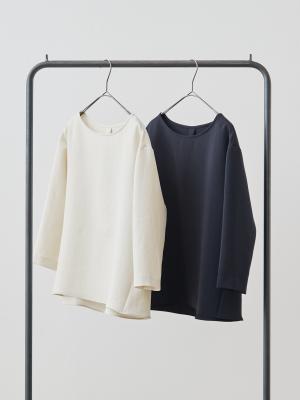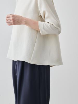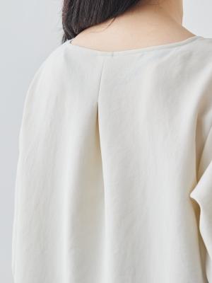 まず「縫製技術」について。例えば「メローロック」を見ていただきたいですね。生地の端がほつれてこないようにミシンで始末することを「ロック」と呼びますが、私たちが得意とするのは、このロック始末の中でも「メローロック」。通常のロック始末よりも幅が狭く、縫い上げるのは簡単ではありません。ですが、マーヤの職人はいとも簡単に1枚の生地を縫い上げます。「Factelier by MARYA」として初めて作った「シルキーサテンストレッチブラウス」もこのメローロックが魅力のひとつ。メローロックをかけることで、縫い幅が細く糸が美しく並ぶので、洋服のドレープ(波打ち)がとてもきれいに出ます。