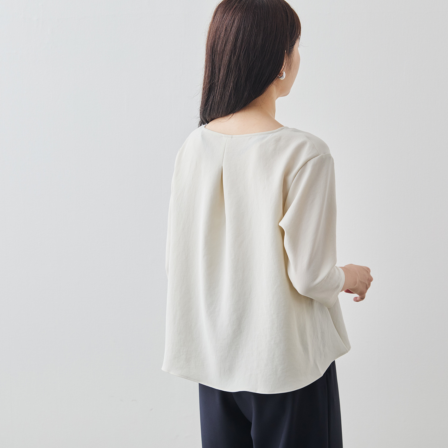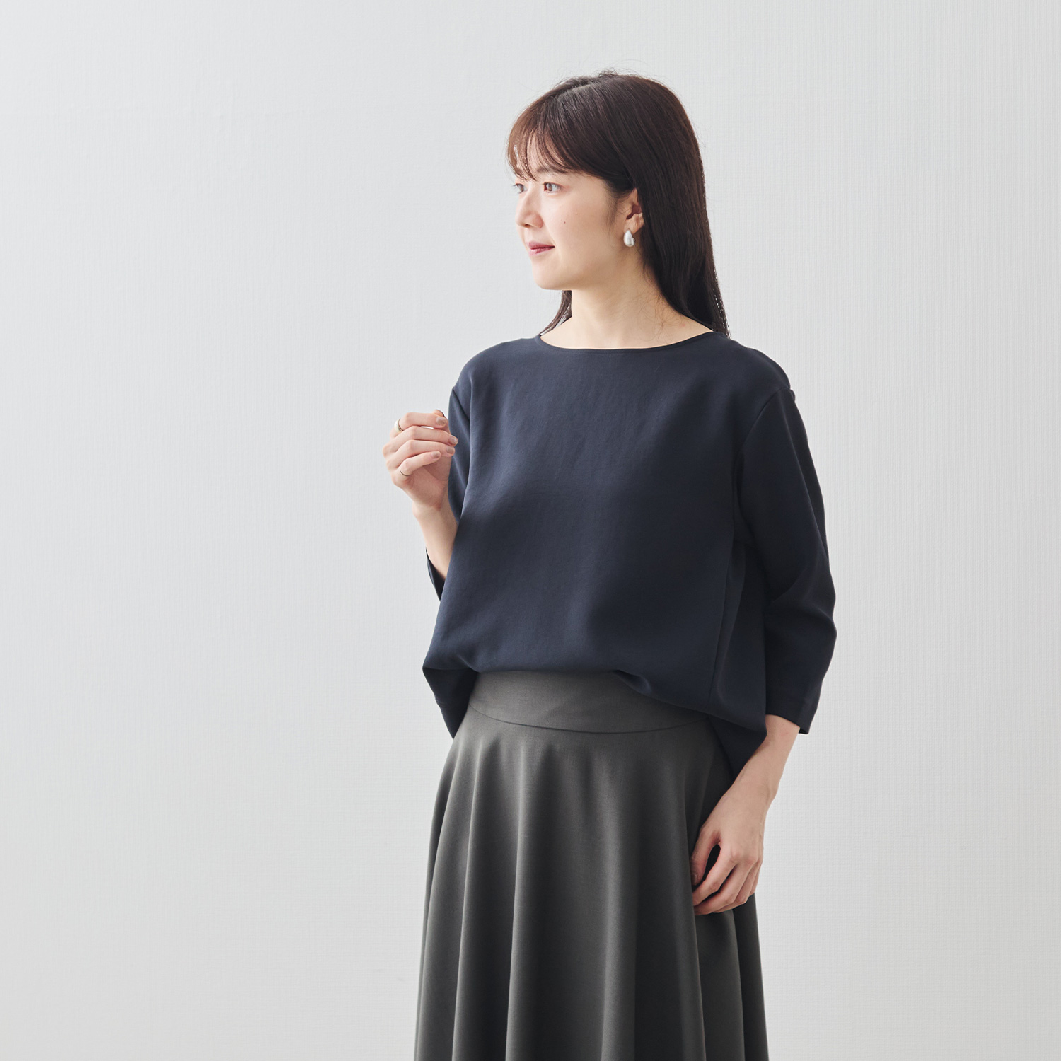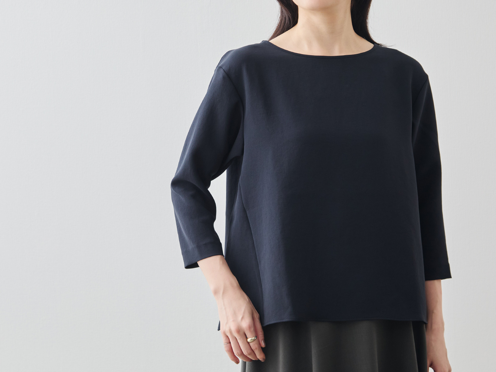 Factelier by MARYAのシルキーサテンストレッチブラウスは「フリーサイズ」で展開しています。フリーサイズのブラウスですが、どんな体形の方でもシルエットやドレープが美しく出るように何度も試作を繰り返しました。この写真のマネキン(トルソー)をご覧いただきたいんですが、それぞれのマネキンはサイズが異なり、右から7号、9号、11号です。サイズが違うマネキンに同じブラウスを着用させていますが、どのマネキンでもドレープが美しく出ていることがお分かりいただけると思います。つまり、一般的な9号をフリーサイズとして展開しているのではなく、“どんな体形”の方でも美しく着こなせるからこそ“フリー”サイズとして製作しました