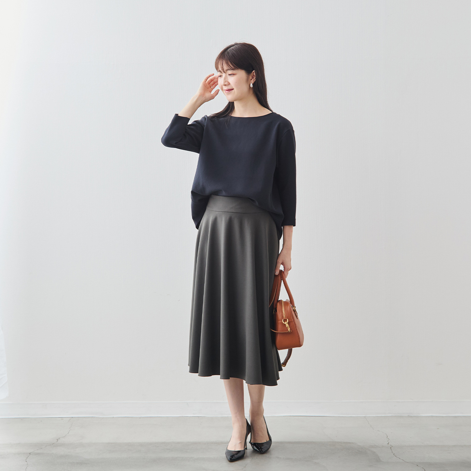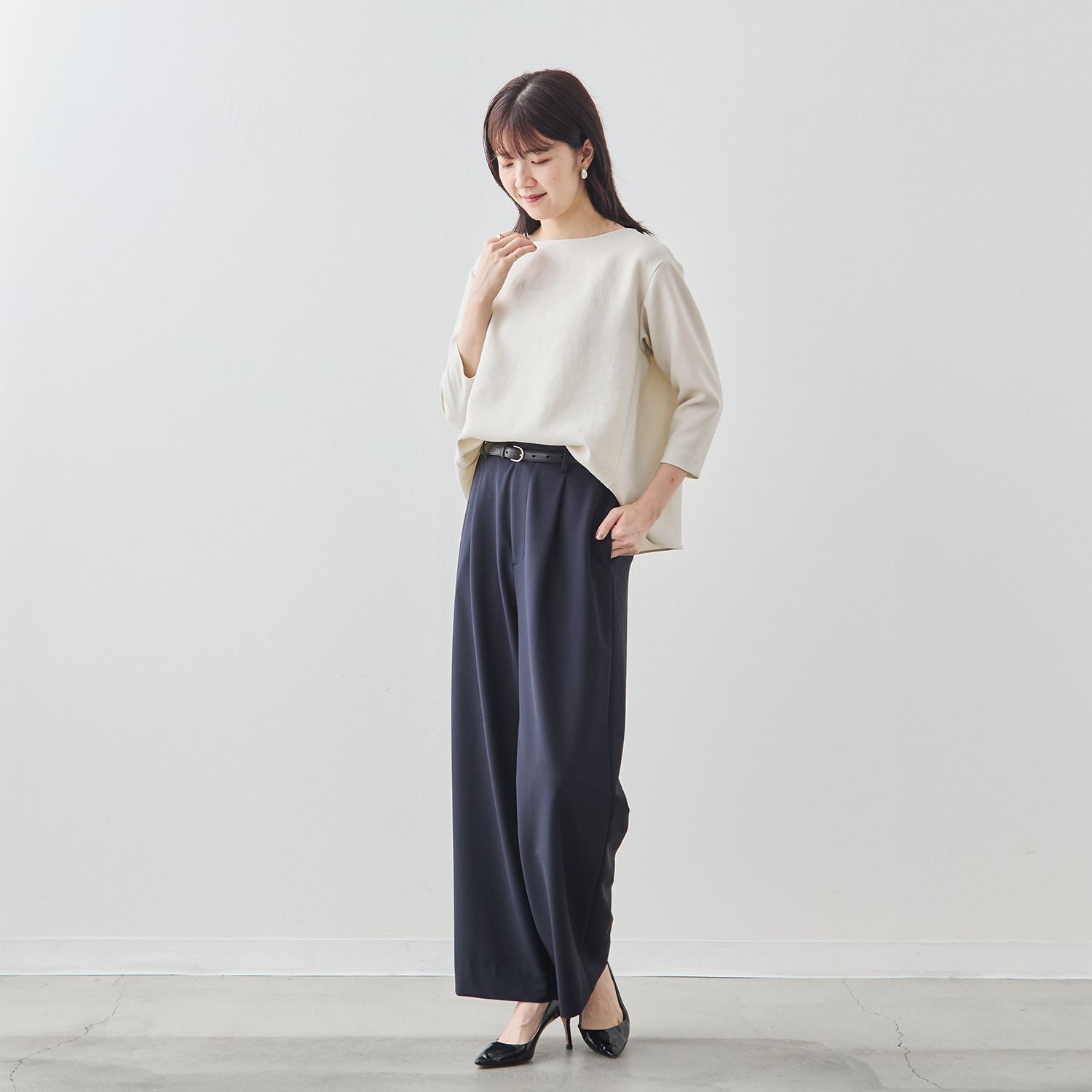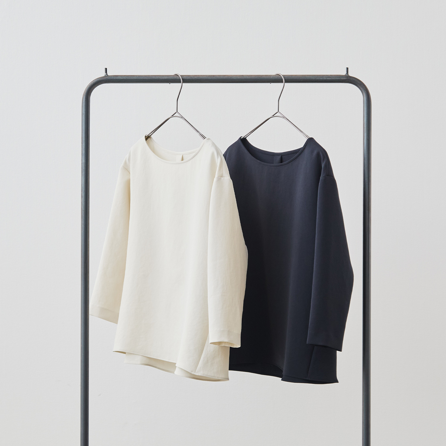 Factelier by MARYAのシルキーサテンストレッチブラウスは「フリーサイズ」で展開しています。フリーサイズのブラウスですが、どんな体形の方でもシルエットやドレープが美しく出るように何度も試作を繰り返しました。この写真のマネキン(トルソー)をご覧いただきたいんですが、それぞれのマネキンはサイズが異なり、右から7号、9号、11号です。サイズが違うマネキンに同じブラウスを着用させていますが、どのマネキンでもドレープが美しく出ていることがお分かりいただけると思います。つまり、一般的な9号をフリーサイズとして展開しているのではなく、“どんな体形”の方でも美しく着こなせるからこそ“フリー”サイズとして製作しました