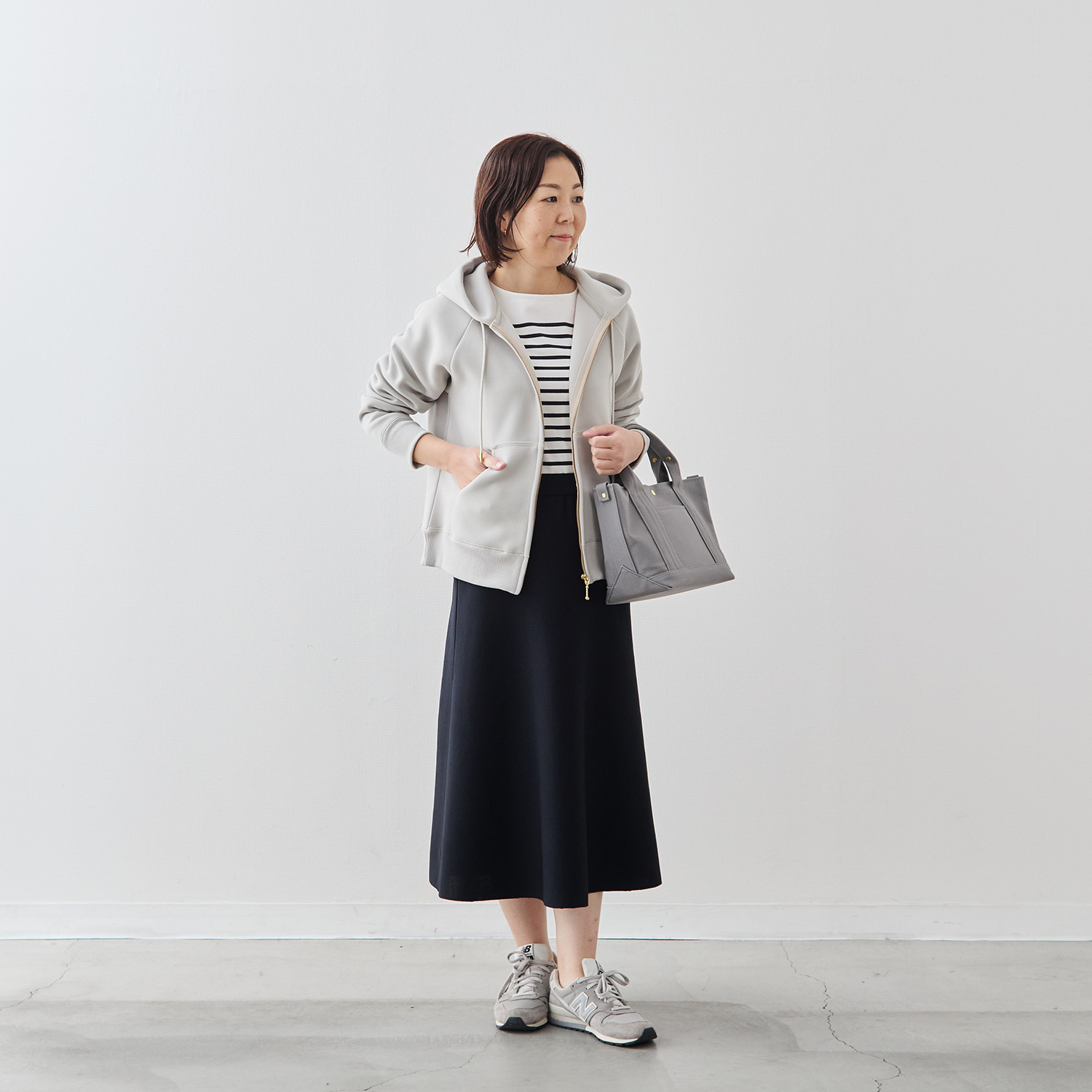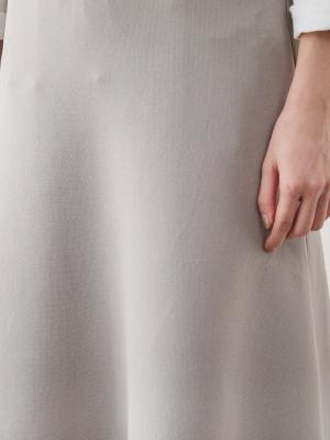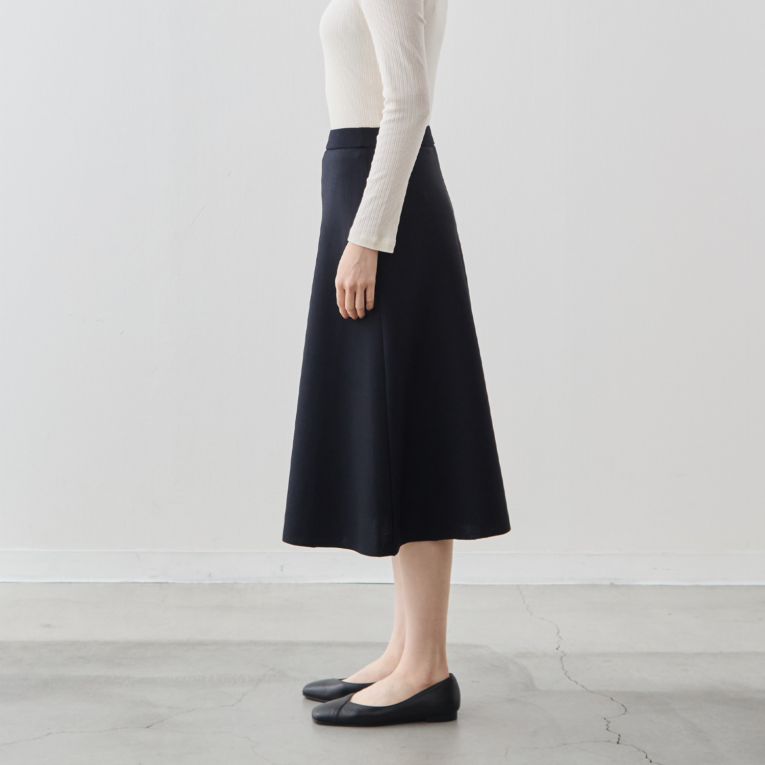 腰回りのボリュームを抑え、ヒップから裾にかけてなだらかに広がるシルエットは、身体のラインを拾いすぎず、立ち姿をすっきり見せてくれます。