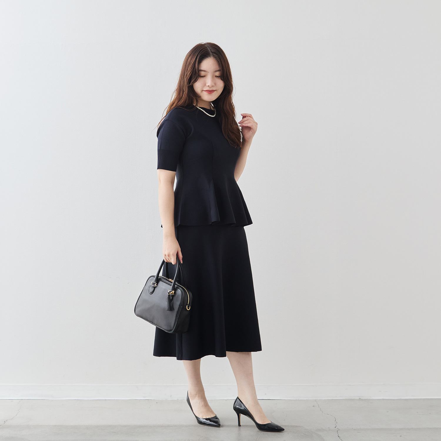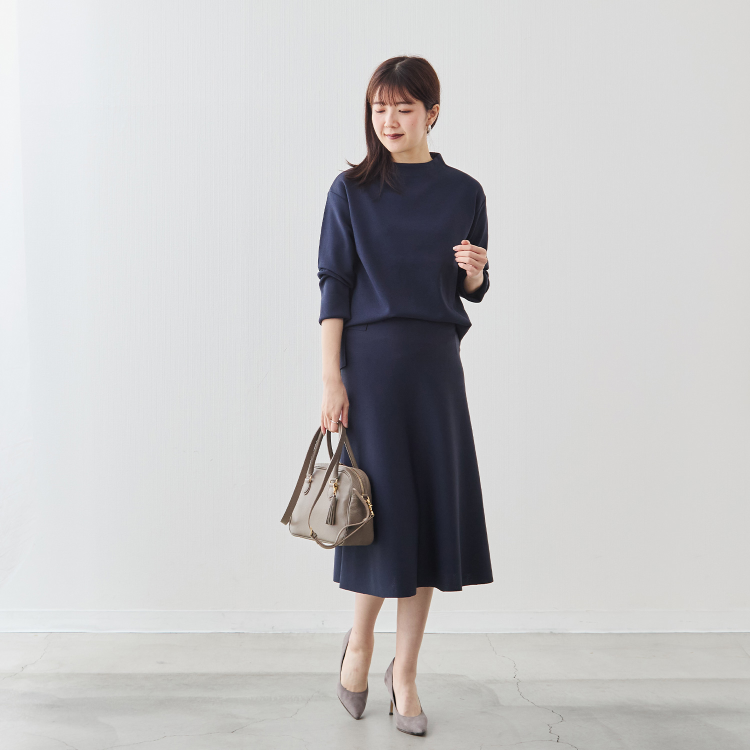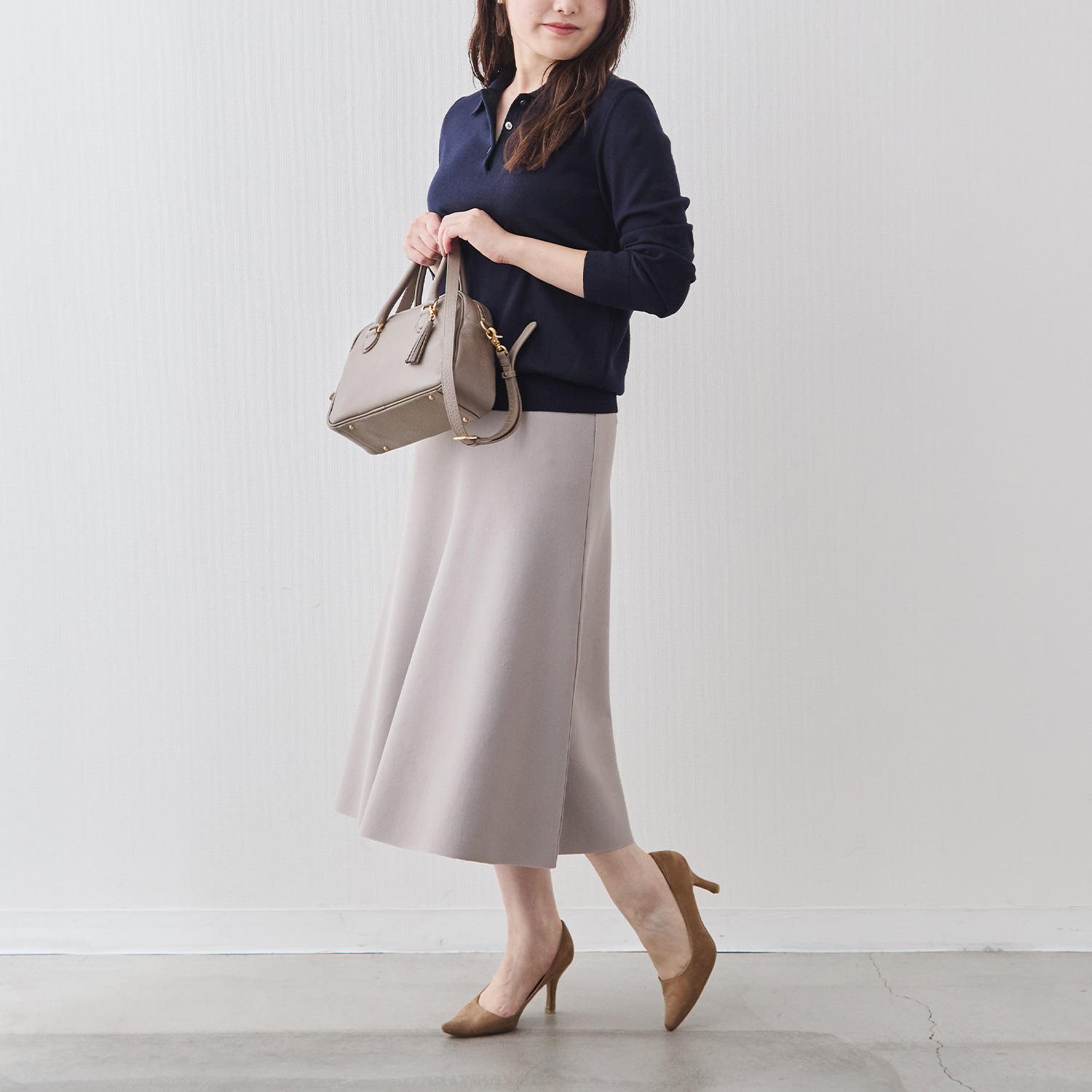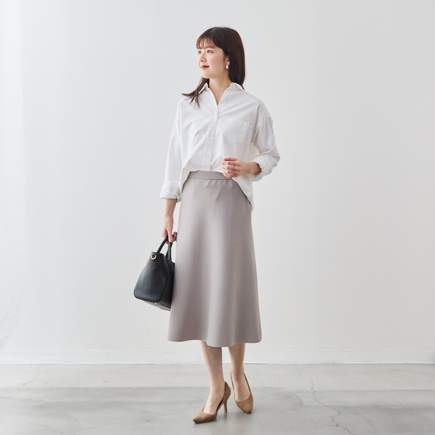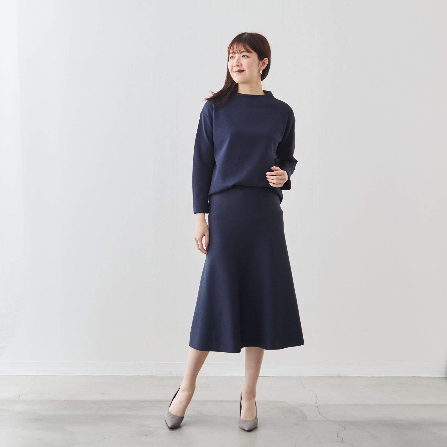 スカートは広がりすぎない、大人のための控えめなフレアライン。