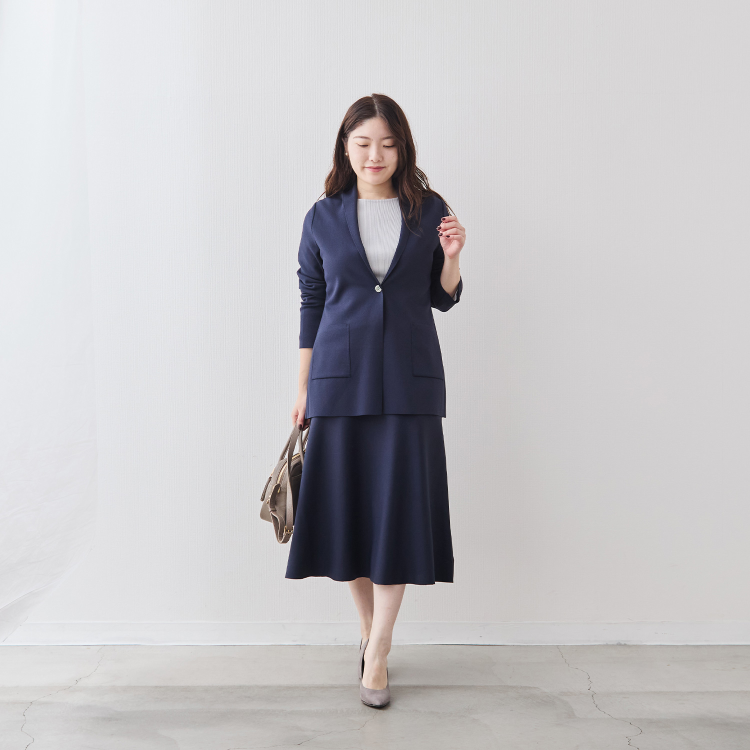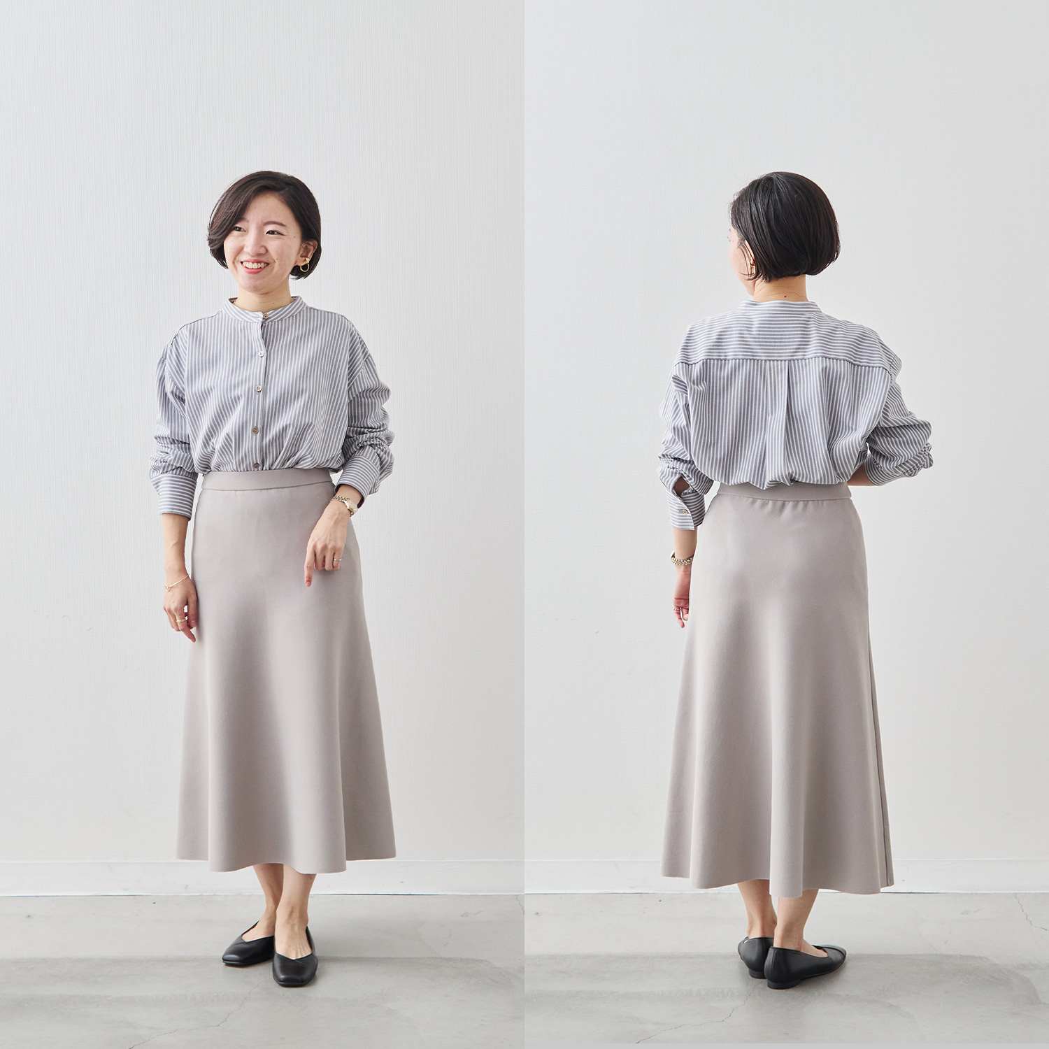 前後差のない着丈はふくらはぎにかかる上品な丈感で、小柄な方でもバランスよく着こなしていただけます。