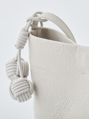 細くカットしたフェイクレザーを丁寧に巻き上げ、手仕事の温もりとブランドの個性を表現しています。