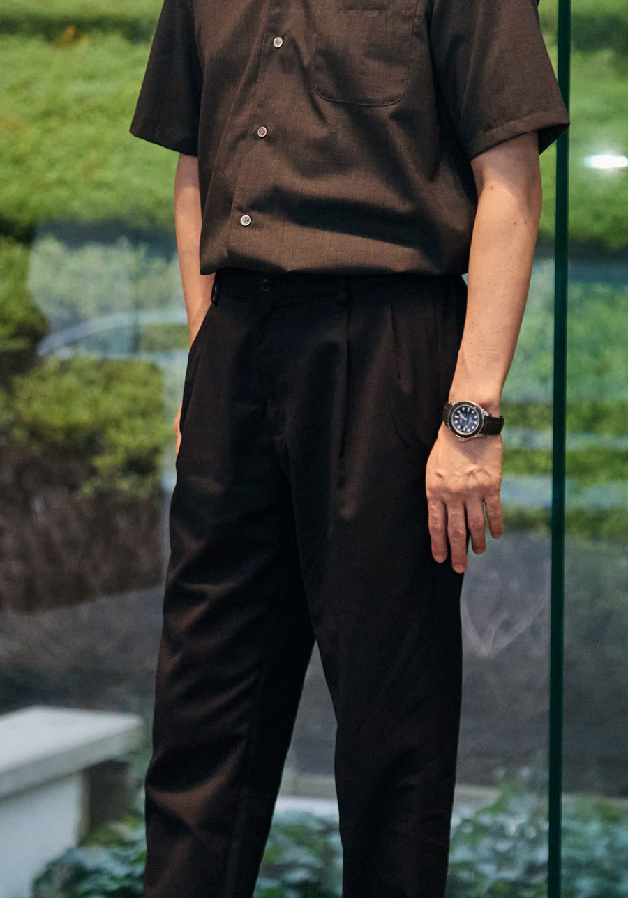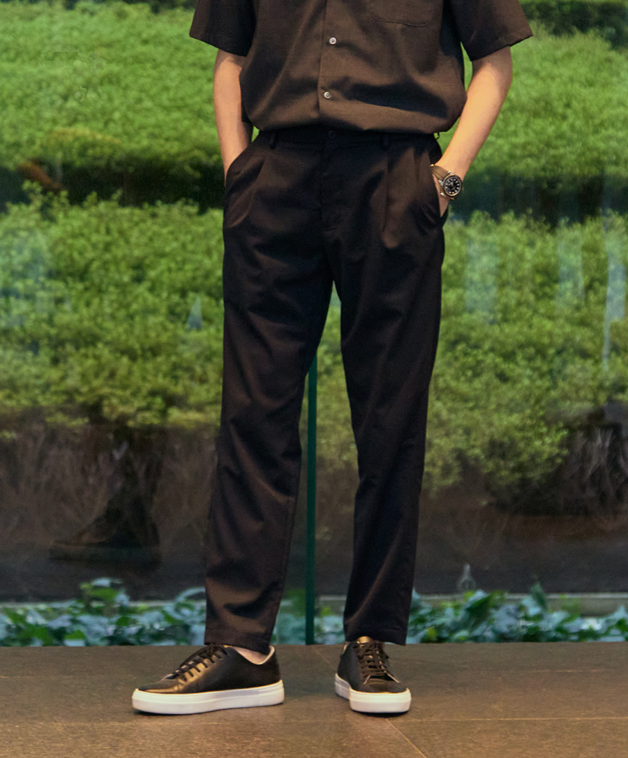 夏だけでなくオールシーズン穿ける「Light Merino テーパード ツータックパンツ」。