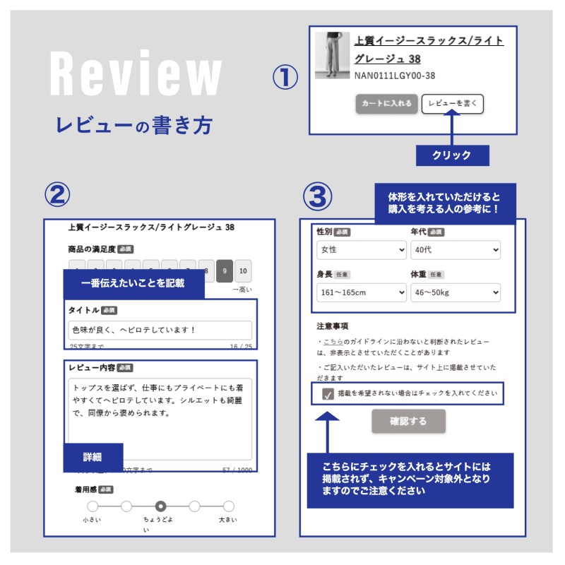 期間中に、ファクトリエでこれまでご購入いただいた対象商品のレビューを投稿するだけで完了!