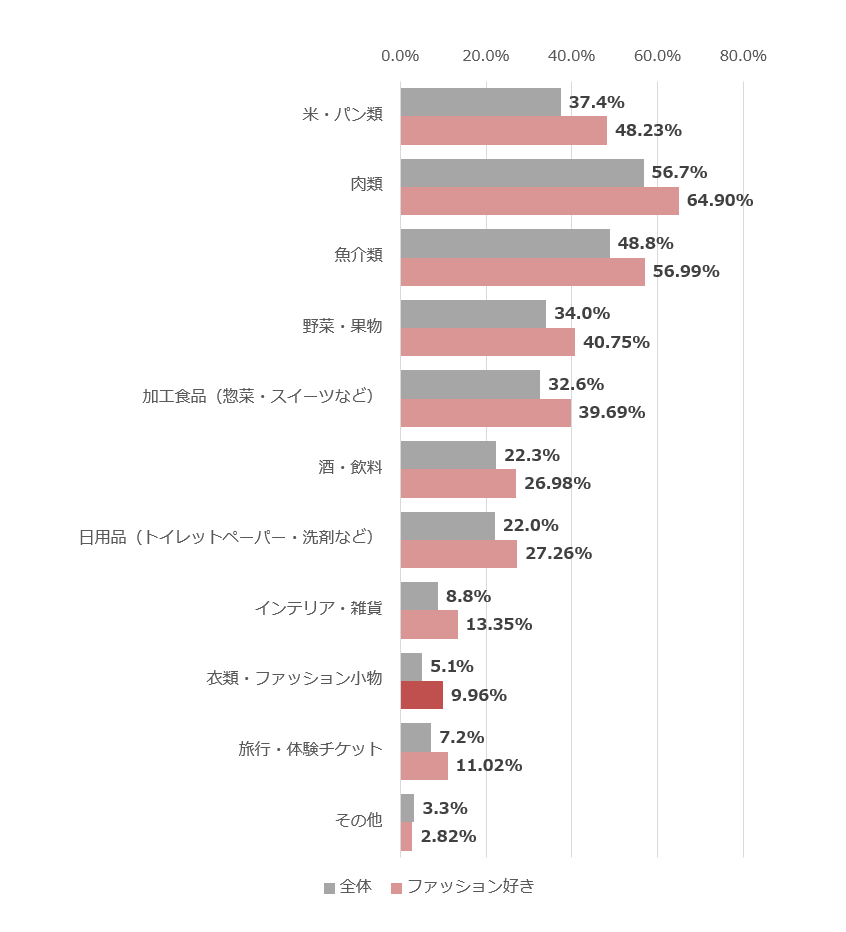 「靴下・肌着」など日用品よりも、ファッション性と品質を両立したアイテムへの関心が高く