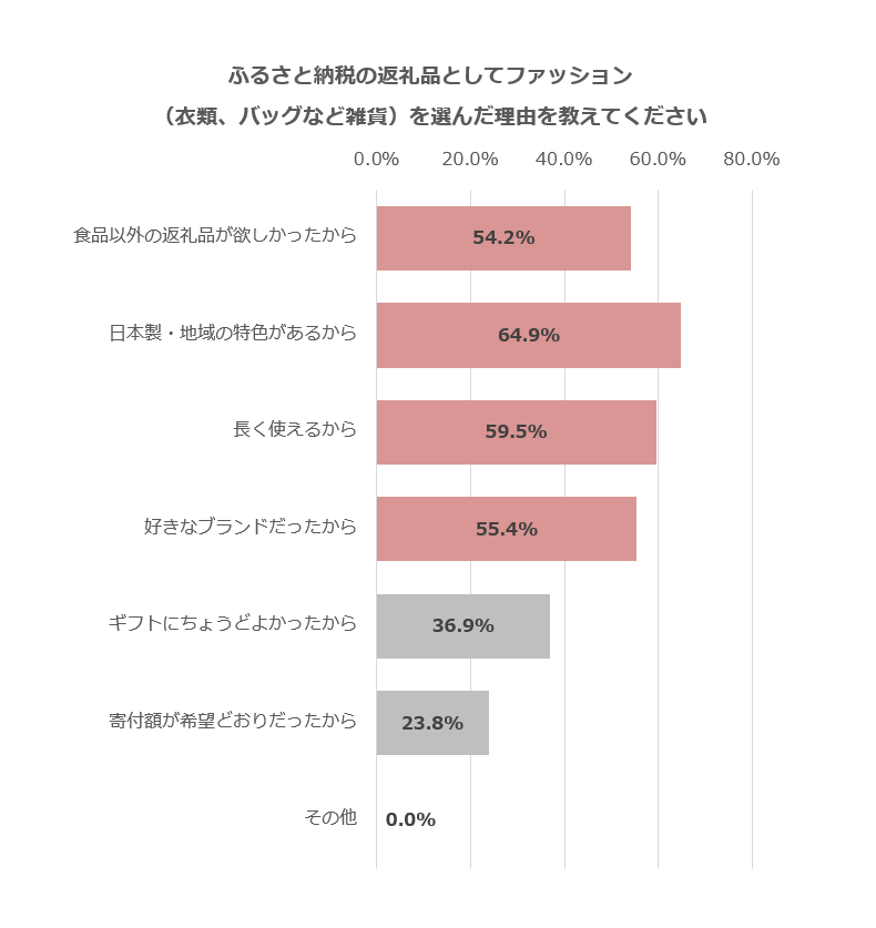 次いで「長く使えるから」(59.5%)、「食品以外の返礼品が欲しかったから」(54.2%)、「好きなブランドだったから」(55.4%)と続き、“消費”よりも“価値や共感”を重視する傾向がうかがえます。