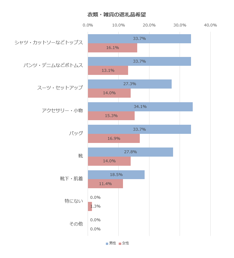 男性では「アクセサリー・小物」(34.1%)が最も多く、次いで「シャツ・カットソー」(33.7%)、「パンツ・デニム」(33.7%)、「バッグ」(33.7%)が続きました。ビジネス・カジュアルの両シーンで使える実用品が上位を占めており、日常的に使える上質なアイテムへのニーズが高いことがうかがえます。