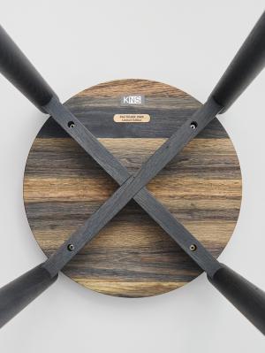 ▲10枚ほどの材木を組み合わせて作る座面の裏側。木部に含まれるタンニン含有量の違いからくる色の違いを特に感じられます。
