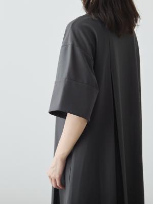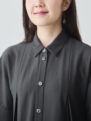 落ち感もありドレープもきれいにでる生地なので、タックをふんだんにデザインにいれてドロップショルダーから自然に流れる広めの五分袖に。