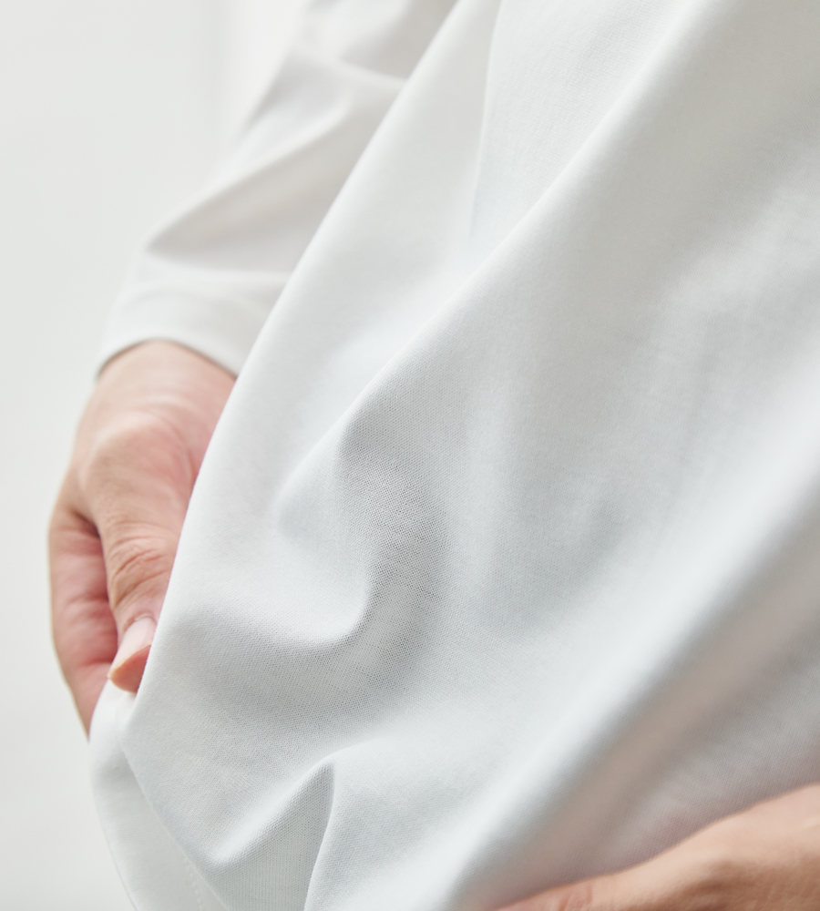 ピマコットンが本来持つなめらかさだけでなく、糸の表面をガスで焼き、余計な毛羽を落とすという“ひと手間”を加えることで、さらにすべすべの触り心地を実現。