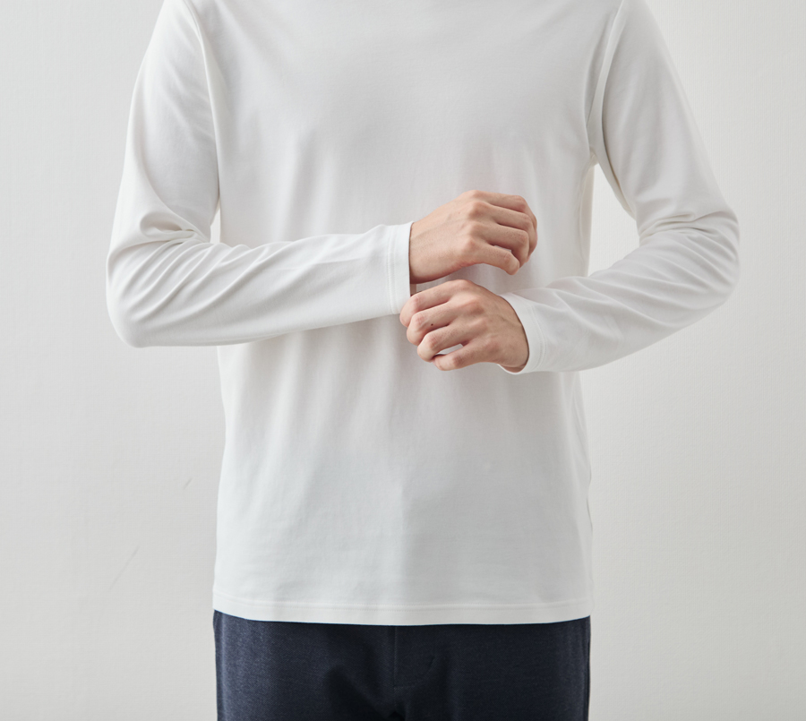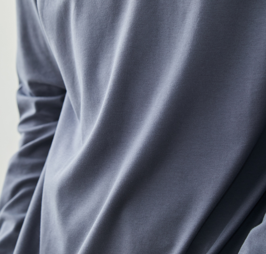 コットン100%ながらカットソーとして未体験の風合いに、つい「気持ちいい・・・」と声が漏れてしまう、そんな素材です。(この「とろみ感」の秘密は後述)
