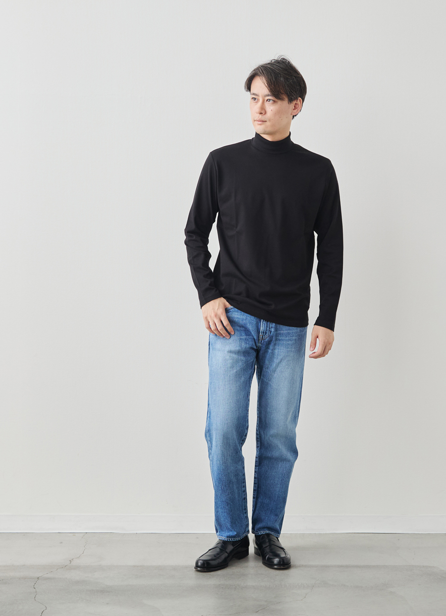 生地の光沢があるからこそ、このタートル1枚でコーディネートが十分サマになります。