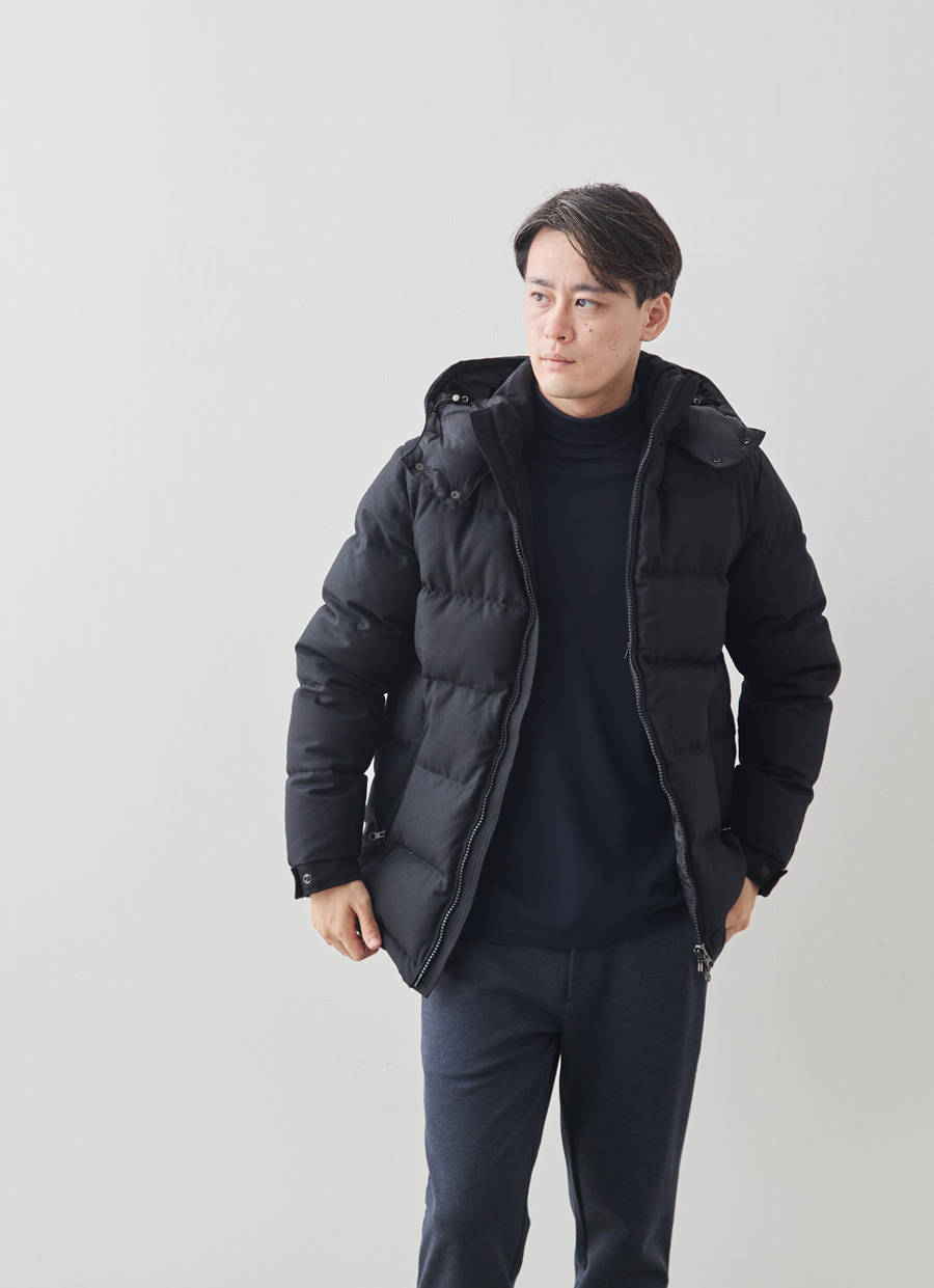 生地の光沢が上質さをまとっているので、スポーティーなエアーパーカーなどのアウターと合わせてもエレガントな大人カジュアルが簡単に作れます。