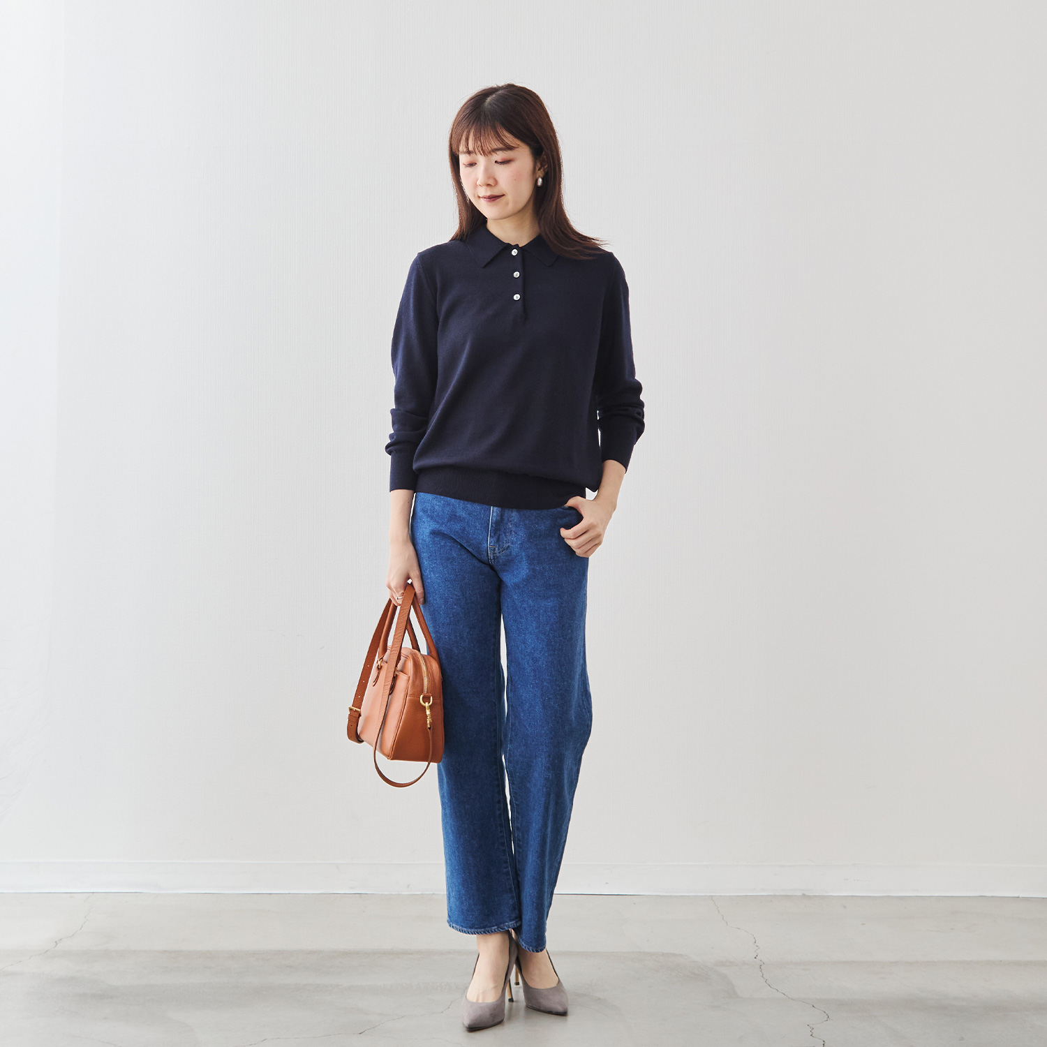 カジュアルなボトムスと合わせても、襟付きだからこそ上品さを損ないません。