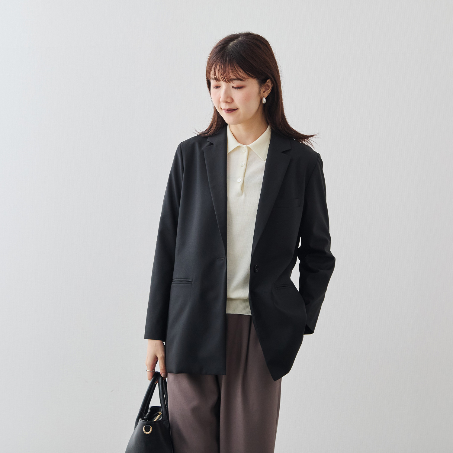 スラックスとジャケットを合わせればきちんと見えするオフィススタイルに。