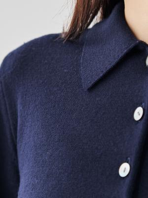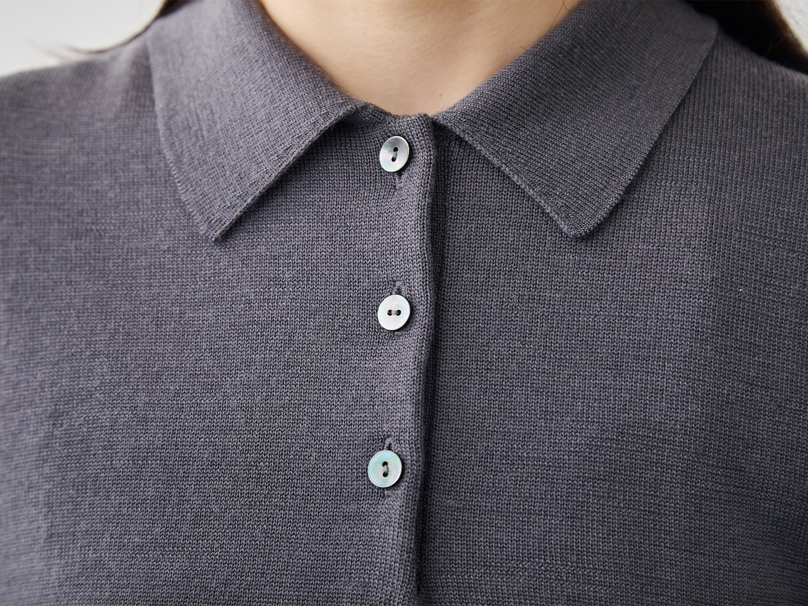 立体感のある襟と、控えめな光沢のある貝ボタンが、