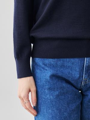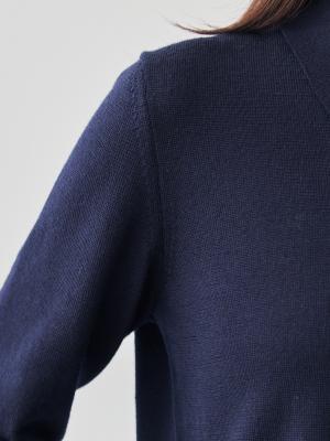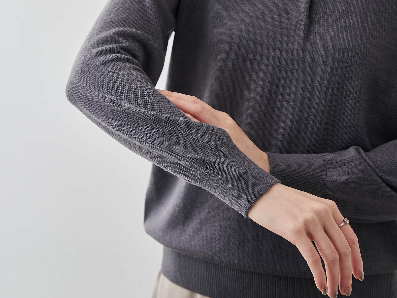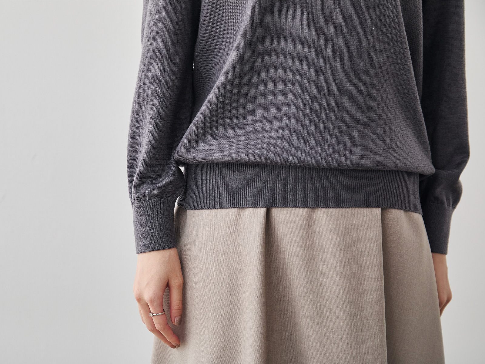糸はウール・シルク・カシミヤを最適な割合で混合。加工工場と協力し、糸にマッチングした加工方法を徹底的に追求することで、滑らかな肌触りや風合いに仕上がっています。シルエットは上質なニット製品らしくスッキリと。着た時にストレスのないように、優秀なパタンナーによって型作りがされ、約通常の2倍の時間がかかる「成型編み」で編まれています。この編み方では、生地を裁断する工程を省き、より立体感のある仕上がりになります。これも上質なニット製品の特徴の一つです。裏地までしっかりと縫われた生地は、着た時に肌にストレスを感じないようにしっかりとリンキングされています。