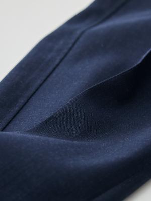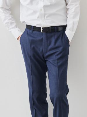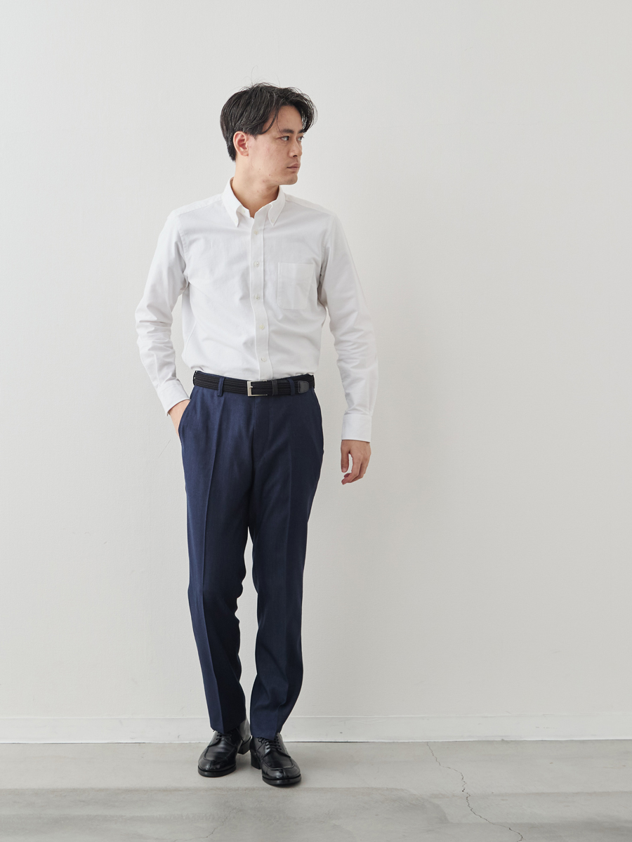 45年以上スラックスを作り続けてきた私たちは、日本人男性の体にフィットするパターンを熟知しています。そのパターンを追求するため、独自機械を開発し、脚のラインに沿う立体的なシルエットを実現しました。特筆すべきはヒップラインの「くせ取り」と呼ばれる、まっすぐなラインしか描けない生地を、プレス機の圧力と蒸気によって立体的かつ丸みのあるラインにすることです。これにより、細身でありながらもヒップの丸みに抜群のフィットラインが生まれます。