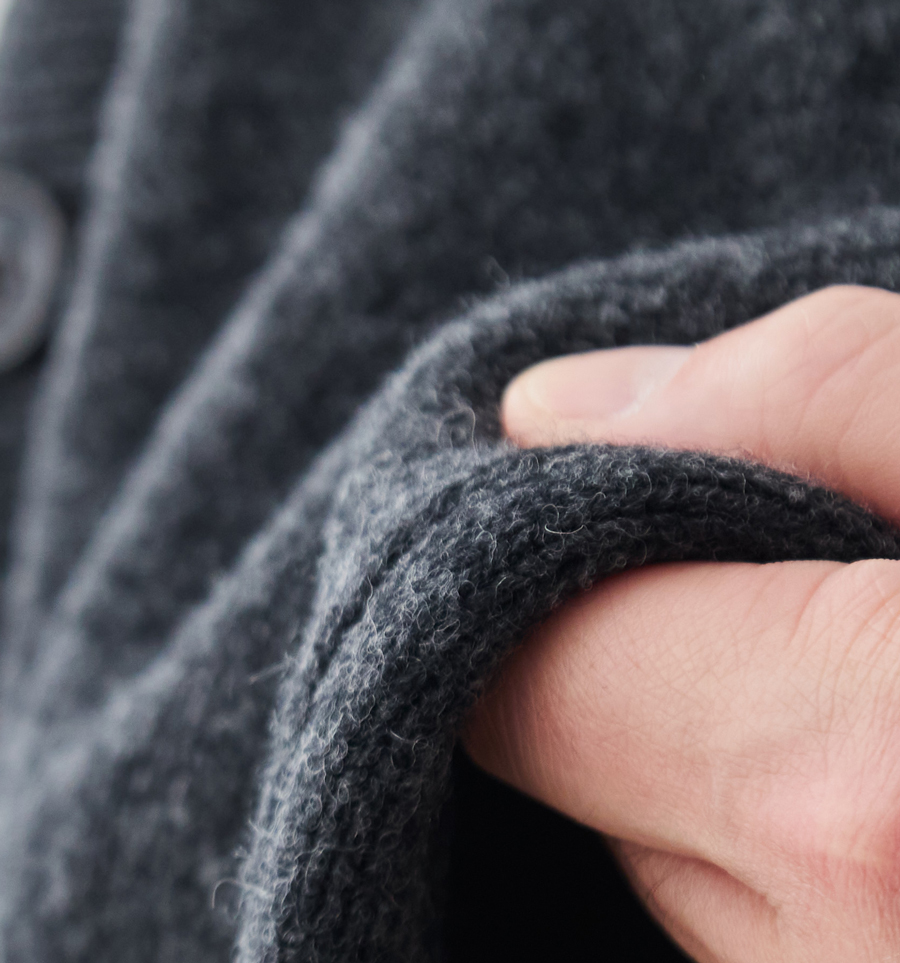 このカーディガンは、柔らかい紡毛糸を使いながらも、しっかりと目を詰めて編み上げています。