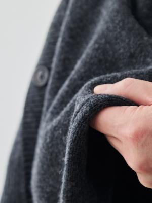 糸はウール・シルク・カシミヤを最適な割合で混合。加工工場と協力し、糸にマッチングした加工方法を徹底的に追求することで、滑らかな肌触りや風合いに仕上がっています。シルエットは上質なニット製品らしくスッキリと。着た時にストレスのないように、優秀なパタンナーによって型作りがされ、約通常の2倍の時間がかかる「成型編み」で編まれています。この編み方では、生地を裁断する工程を省き、より立体感のある仕上がりになります。これも上質なニット製品の特徴の一つです。裏地までしっかりと縫われた生地は、着た時に肌にストレスを感じないようにしっかりとリンキングされています。