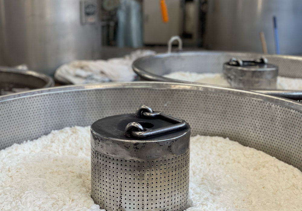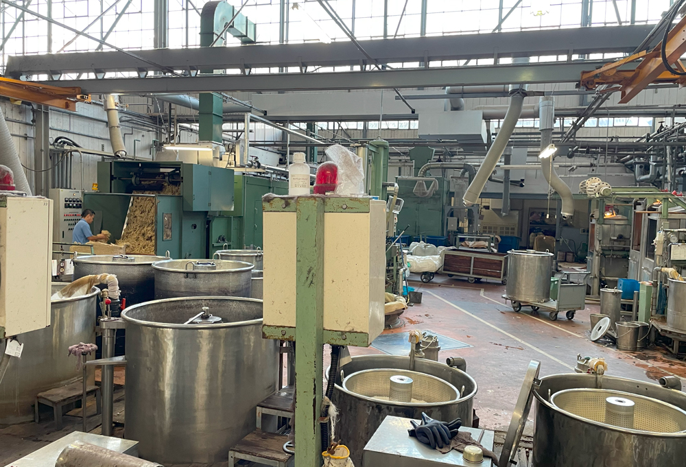 原毛を釜で染色し、高温の乾毛機にかけて乾燥させます。この最初の段階でカシミヤの色と品質が決定するため、非常に重要な工程です。