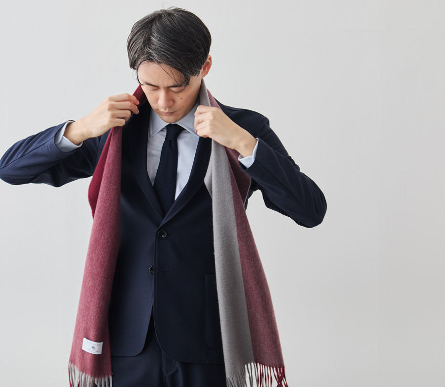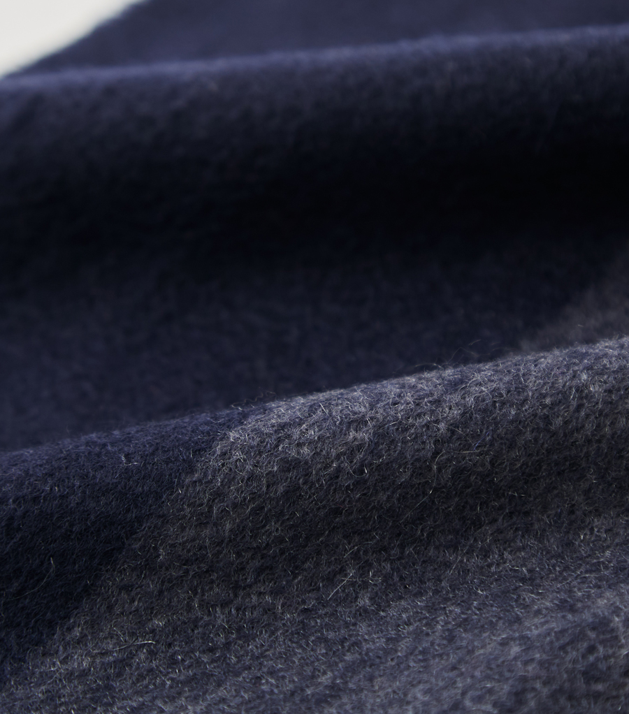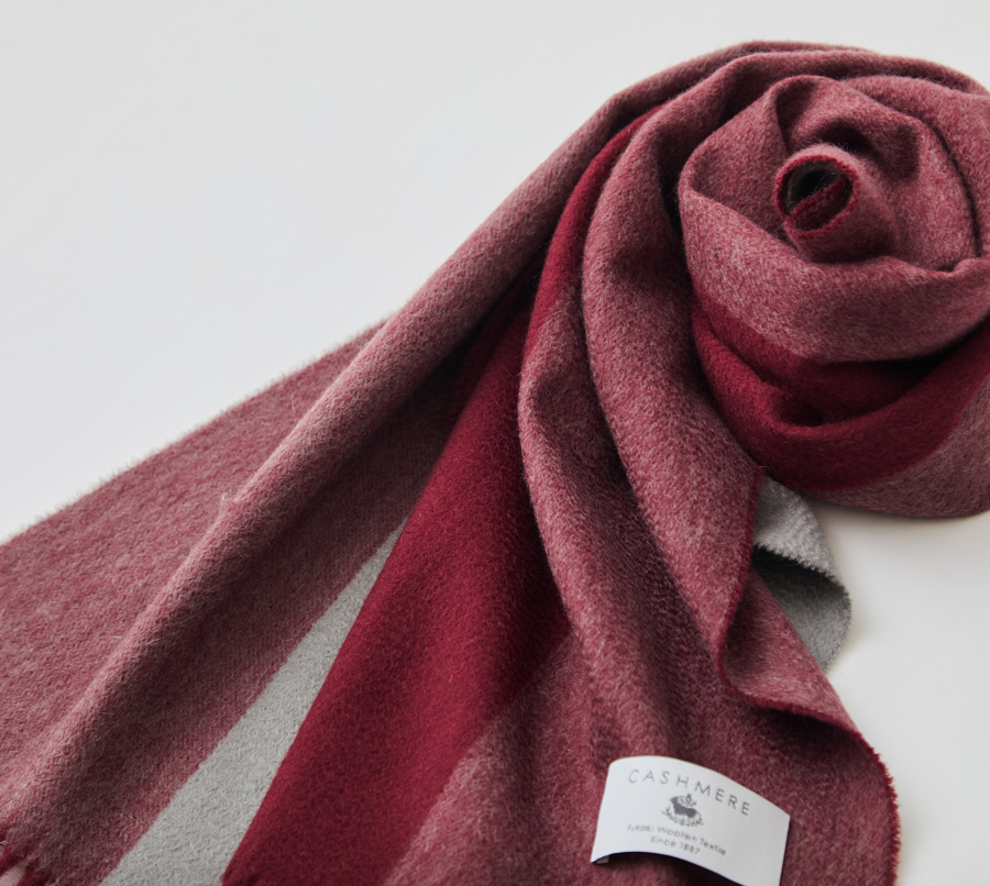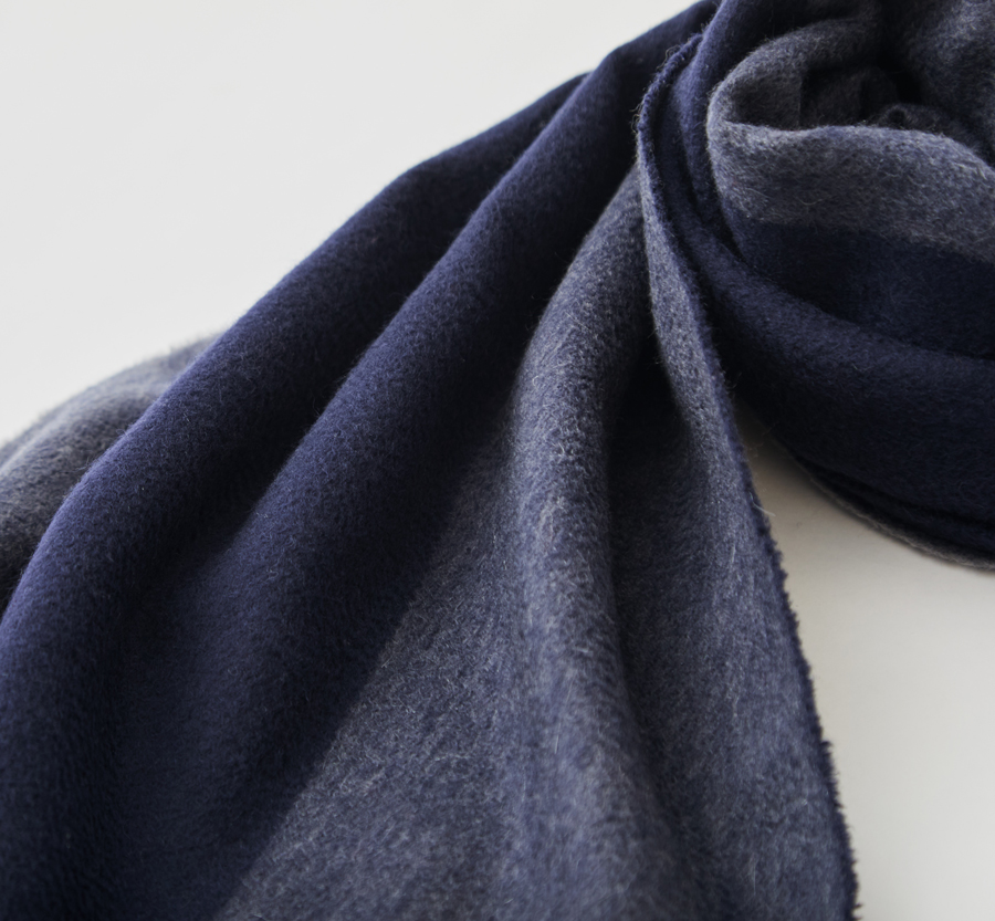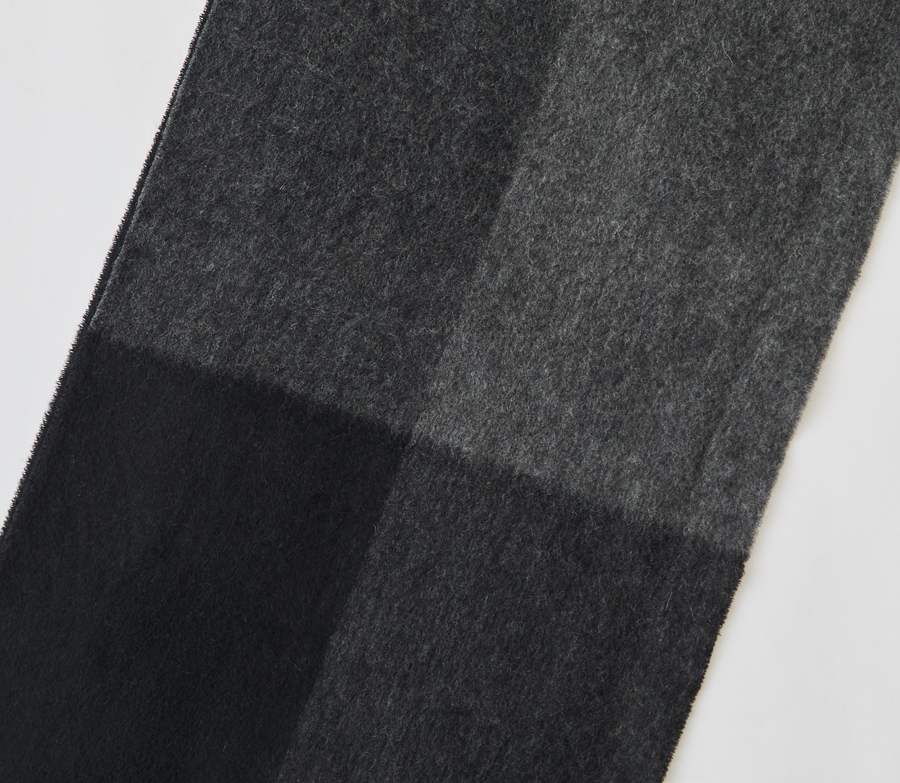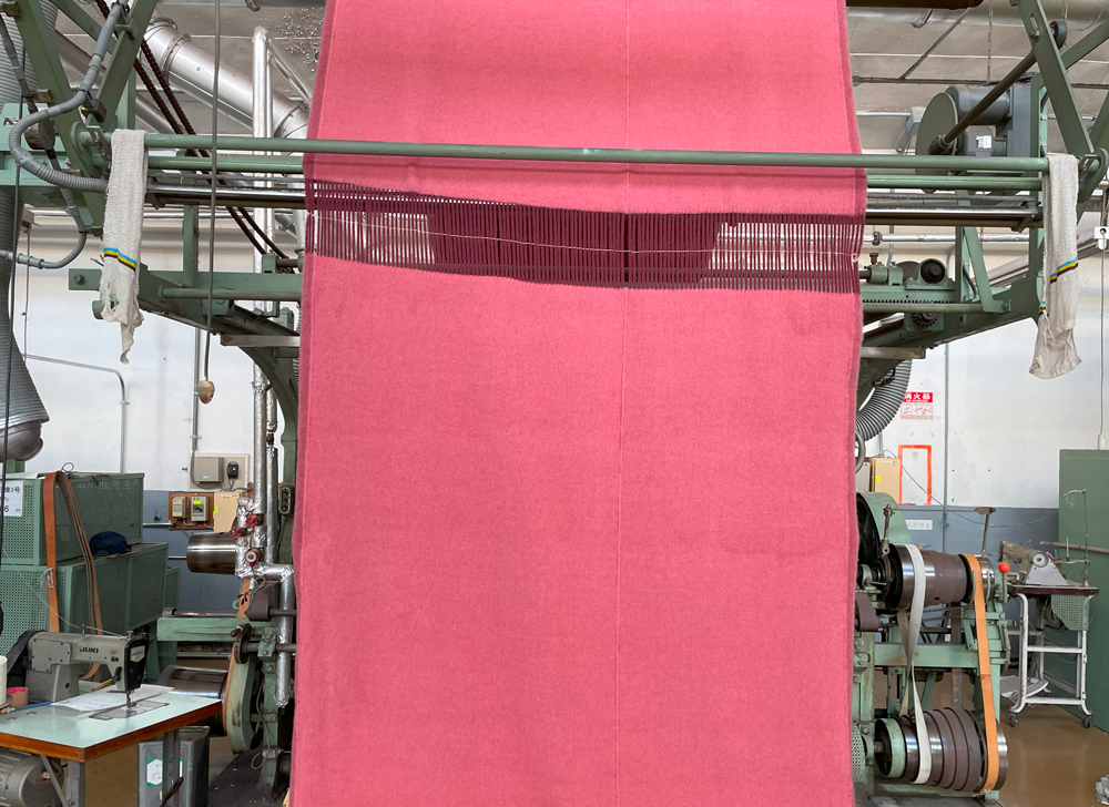 このこだわりは、織物のため目付が重いことからも明らかです。また後述するとおり、製造工程の過程でカシミヤがロスしていく量も多く、このぜいたくな使い方が、深喜毛織の製品を他社と一線を画すものにしています。