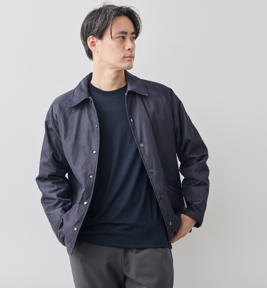 これまでファッションアイテムにはほとんど採用されてこなかったこの素材を、一枚でもジャケットのインナーとしてもサマになるTシャツに仕上げました。