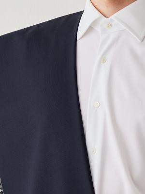 那須夢工房のスーツの特徴である首廻りに吸い付く棒衿は、背骨に全重心がかかるように設計されているので、スーツの重みを感じさせません。また、日本人男性に多い体型に合った肩まわりのつくりで、腕を前方にスムーズに動かしやすくしているのも特徴の1つです。