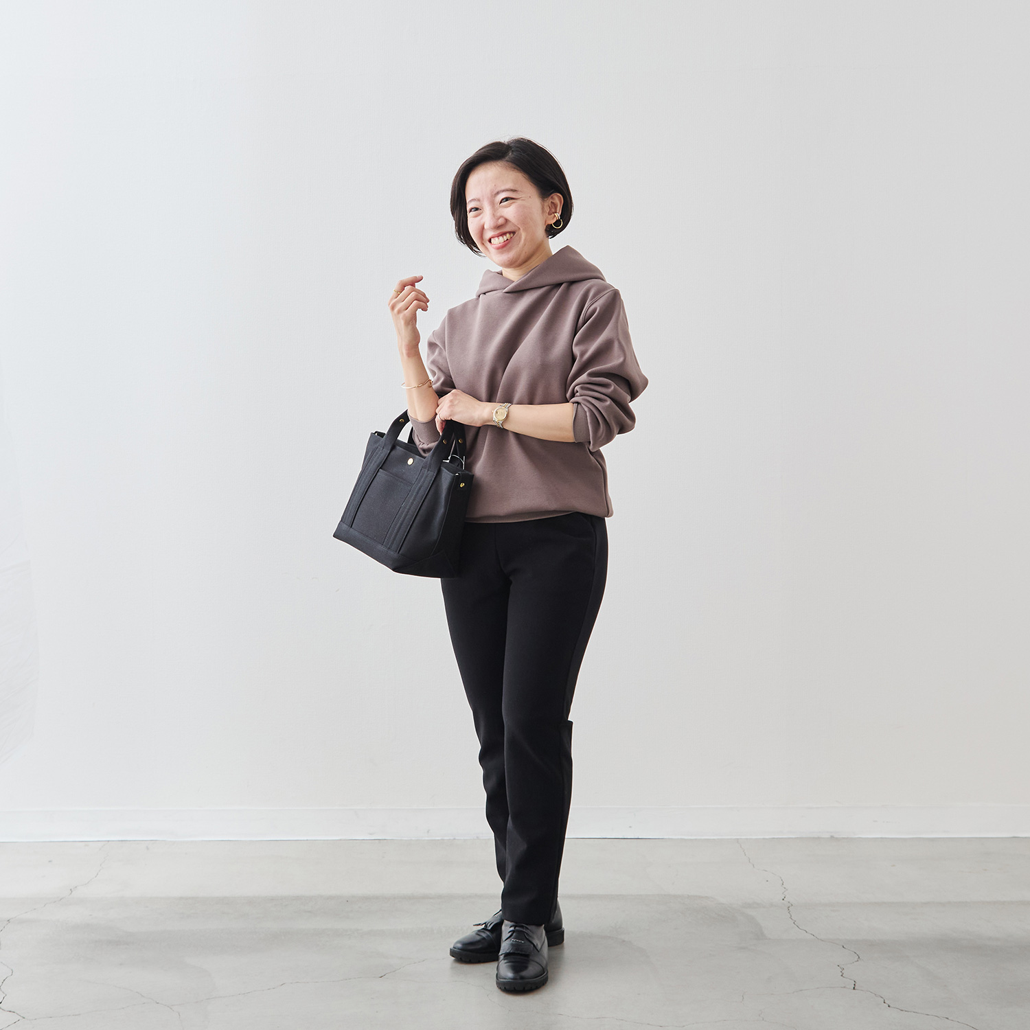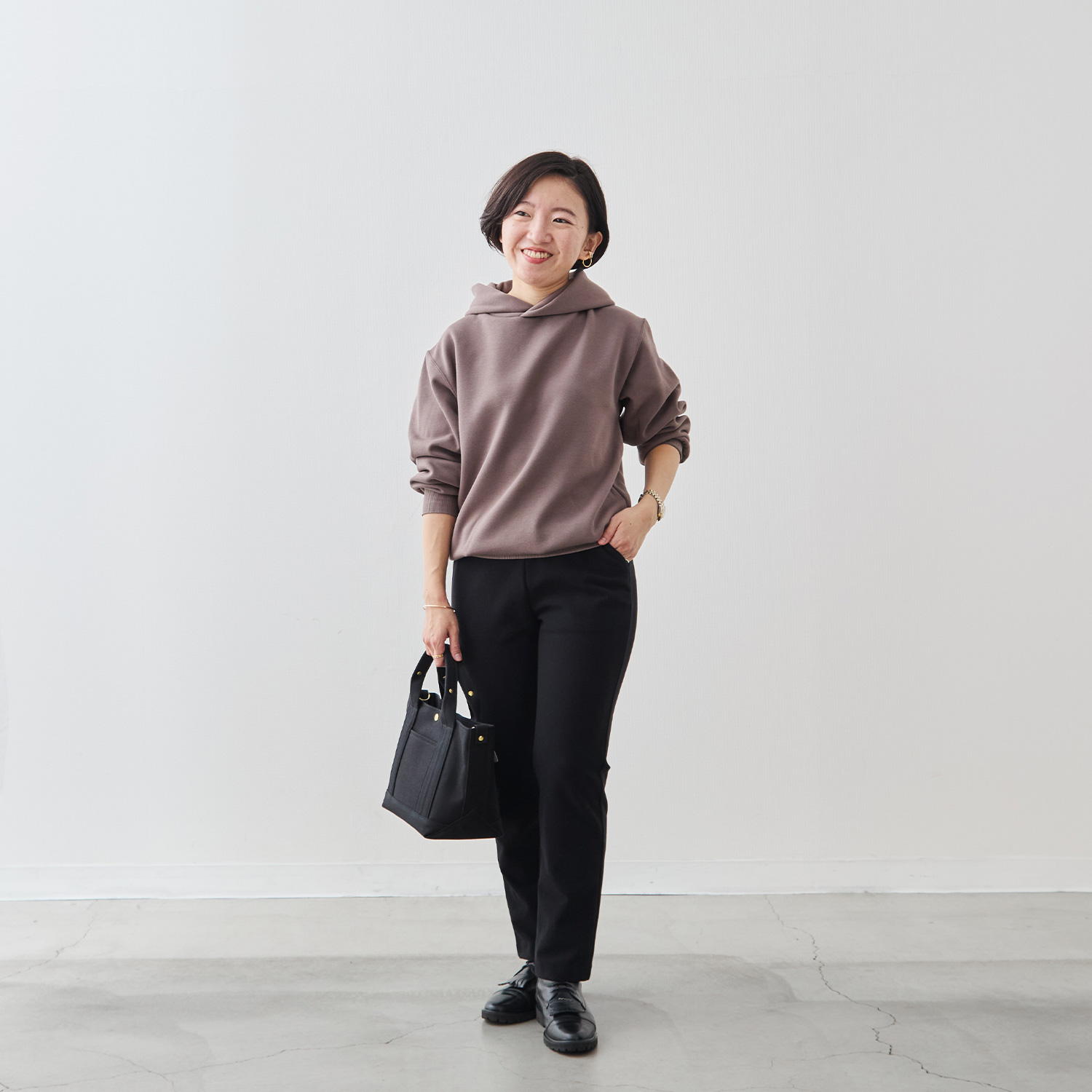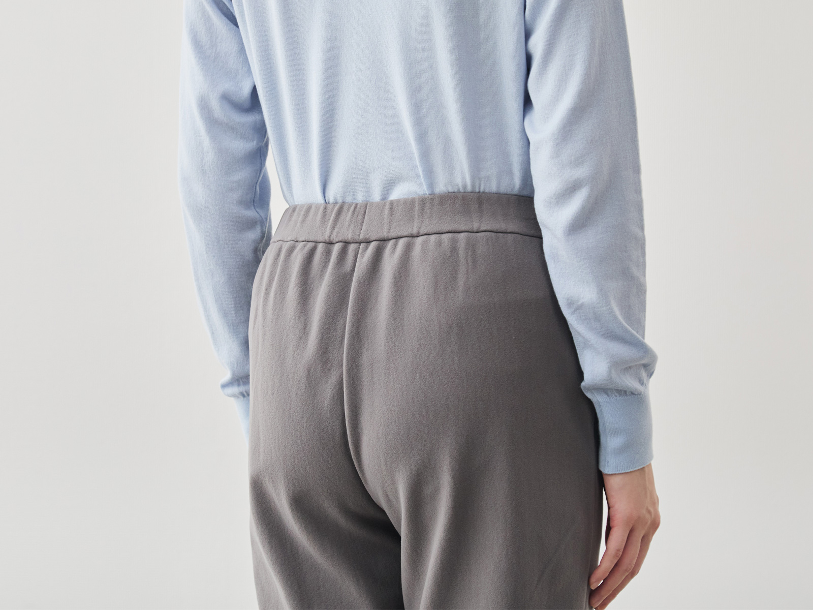 コンシェルジュの深井は、38サイズ・40サイズのどちらのサイズでもOK。普段ファクトリエのボトムスは40サイズを選ぶことが多い深井ですが、このパンツはウエストゴムでヒップ周りにもゆとりがあるため38でも着用可能。