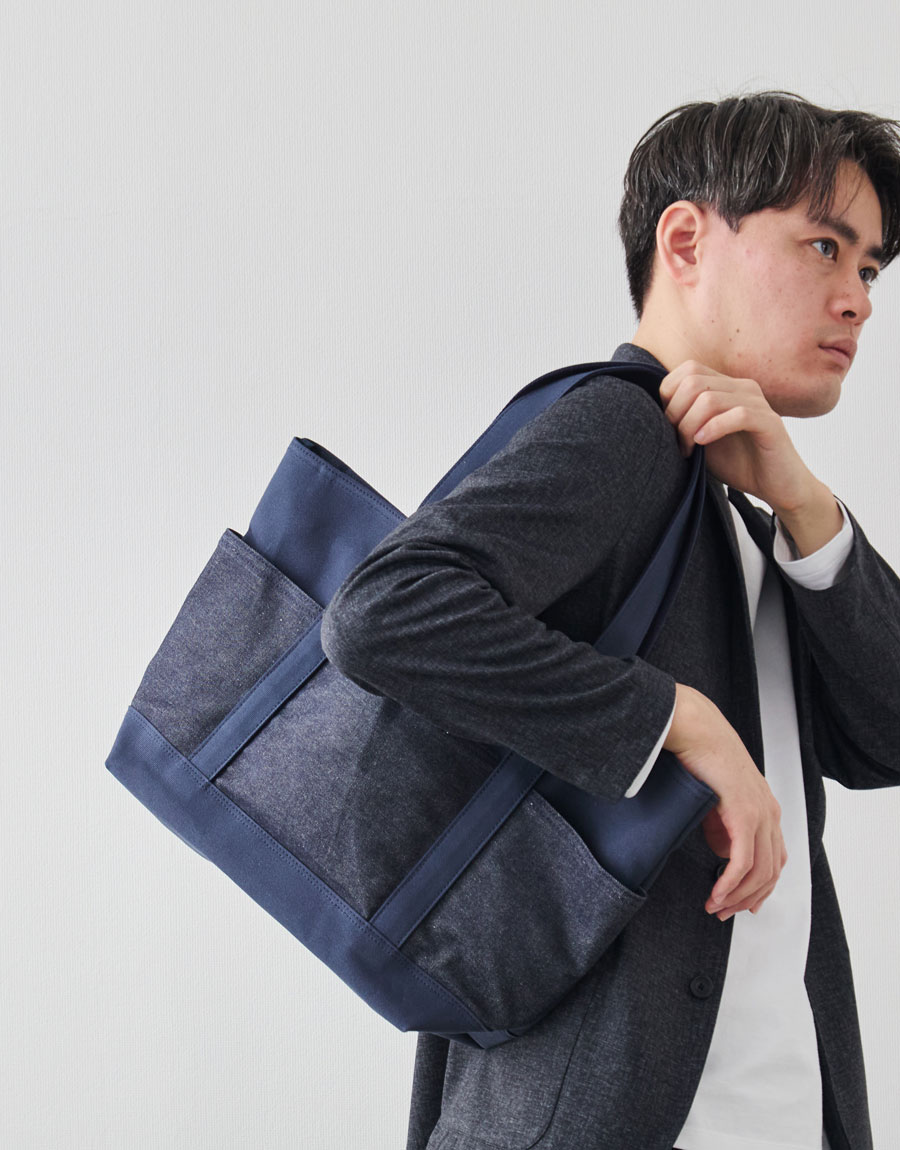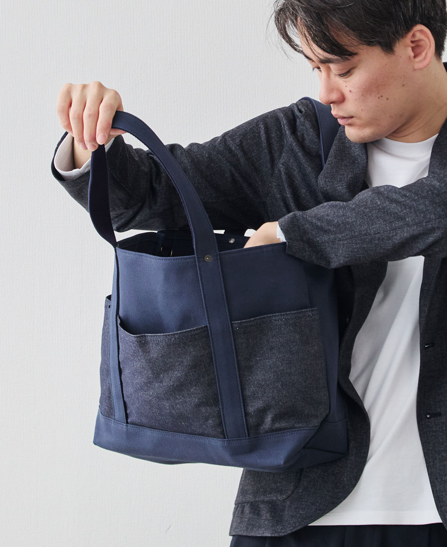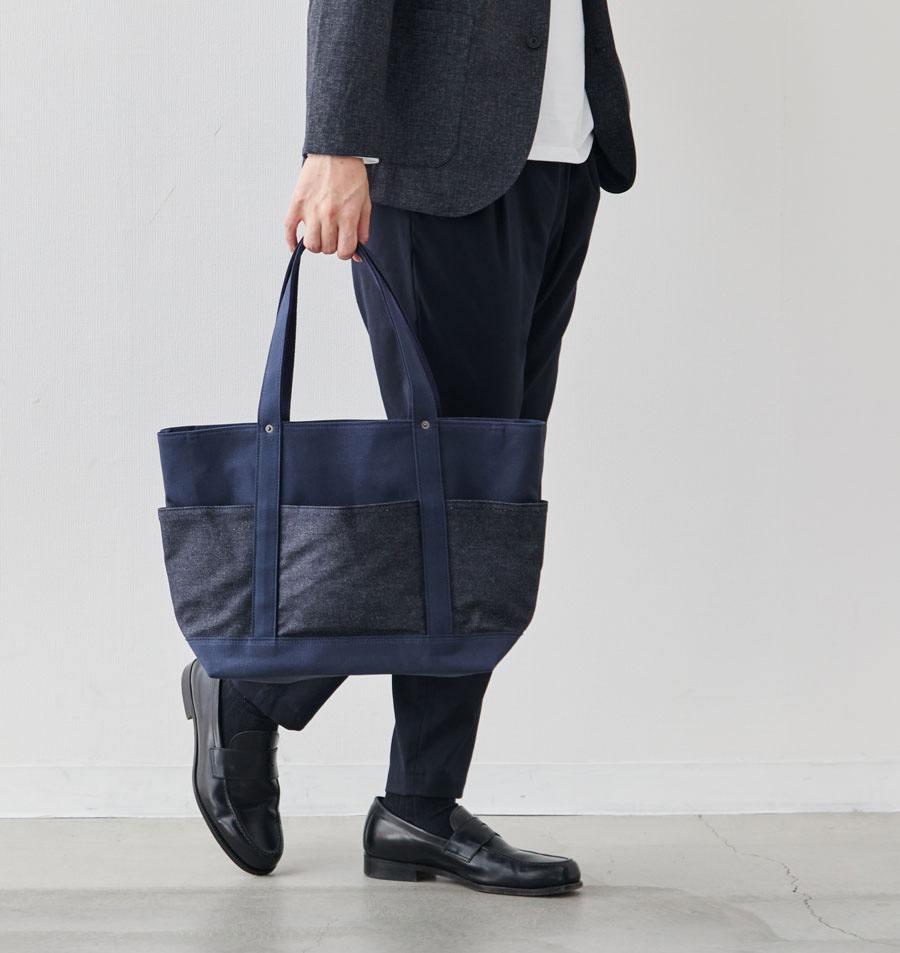 深海のようなディープオーシャン帆布に、リジット(生デニム)風の濃紺デニムを配置。知的で清潔感があり、ジャケパンスタイルとの相性も抜群。