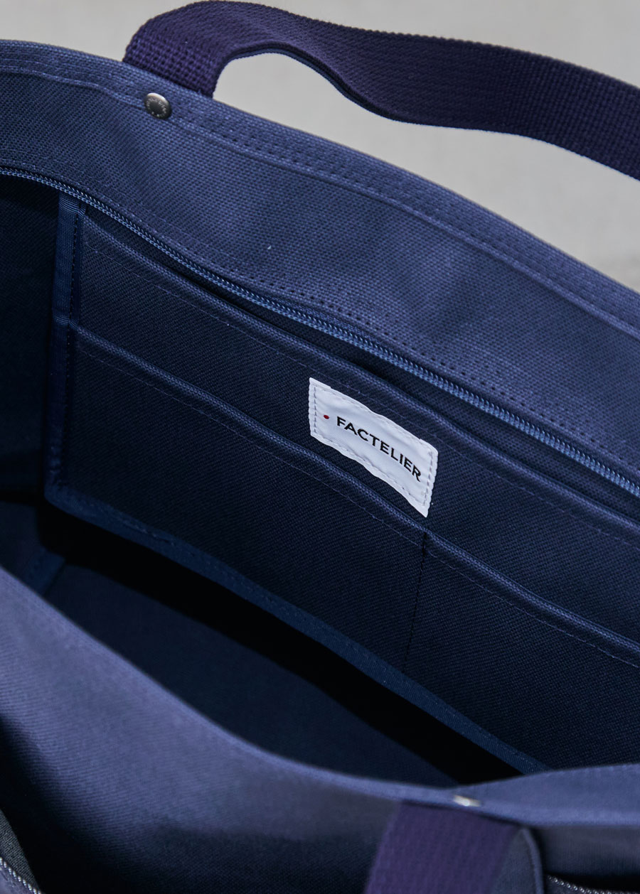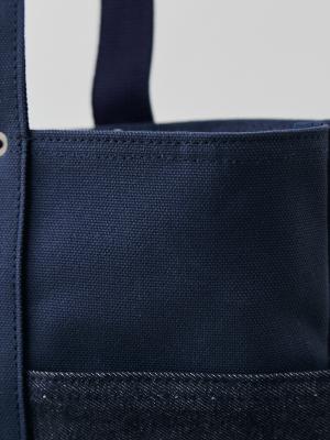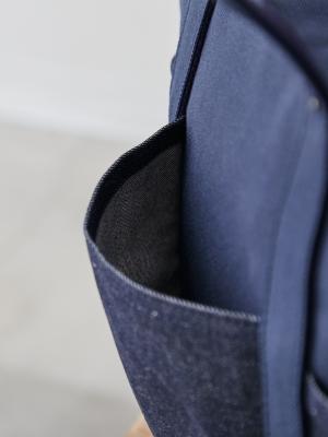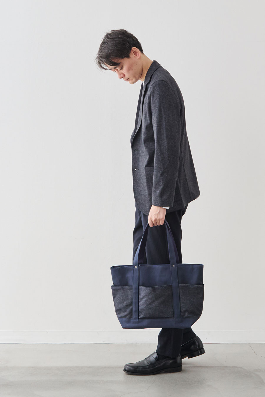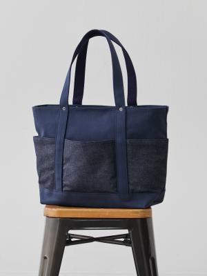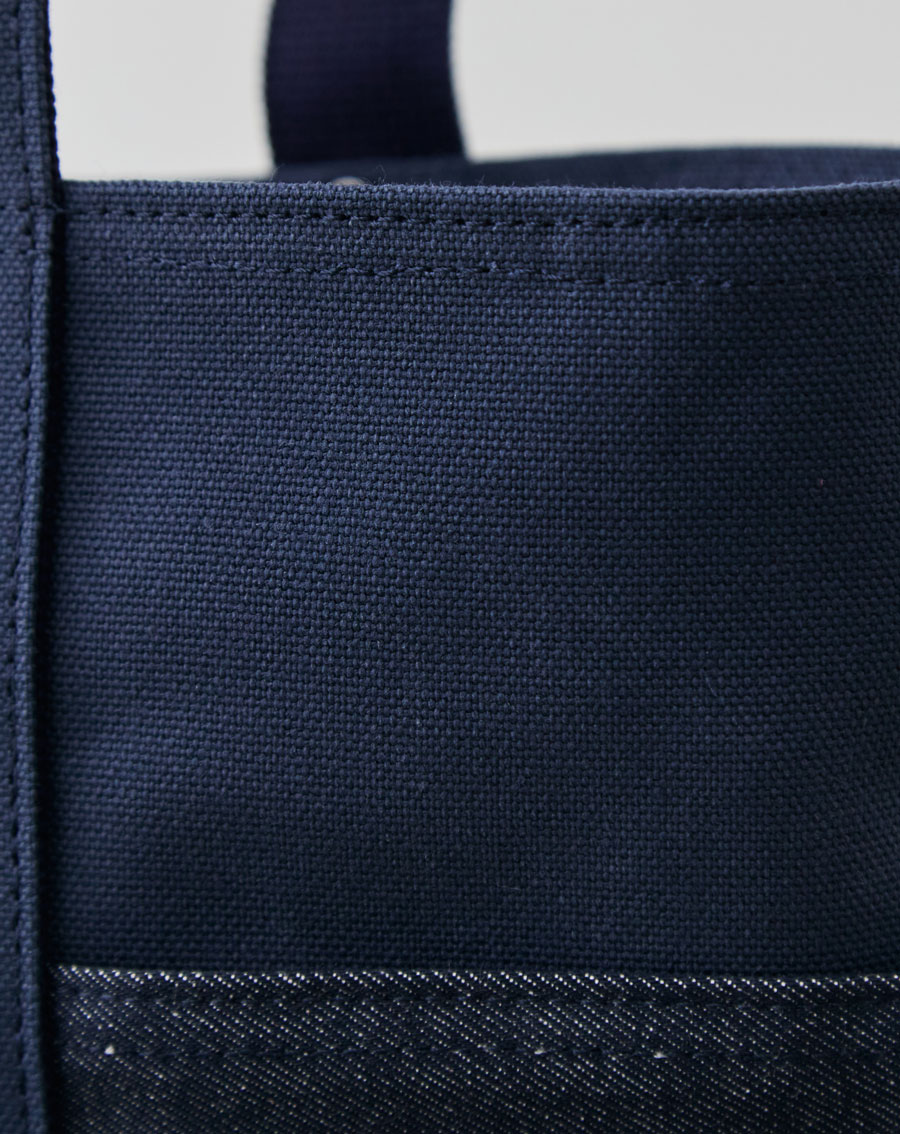 深海のようなディープオーシャン帆布に、リジット(生デニム)風の濃紺デニムを配置。知的で清潔感があり、ジャケパンスタイルとの相性も抜群。