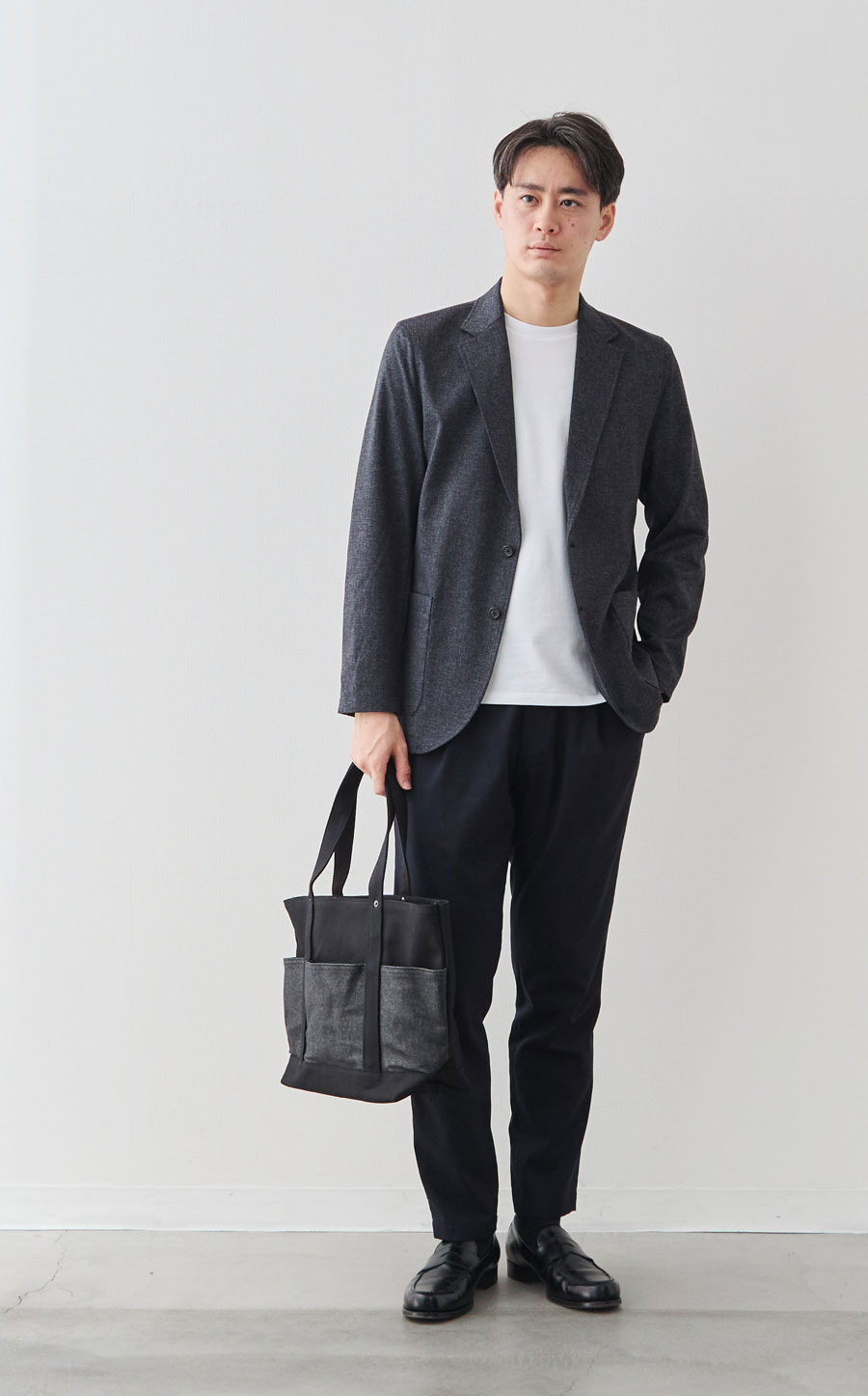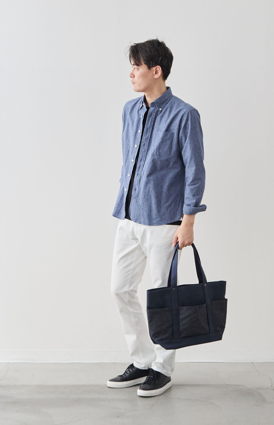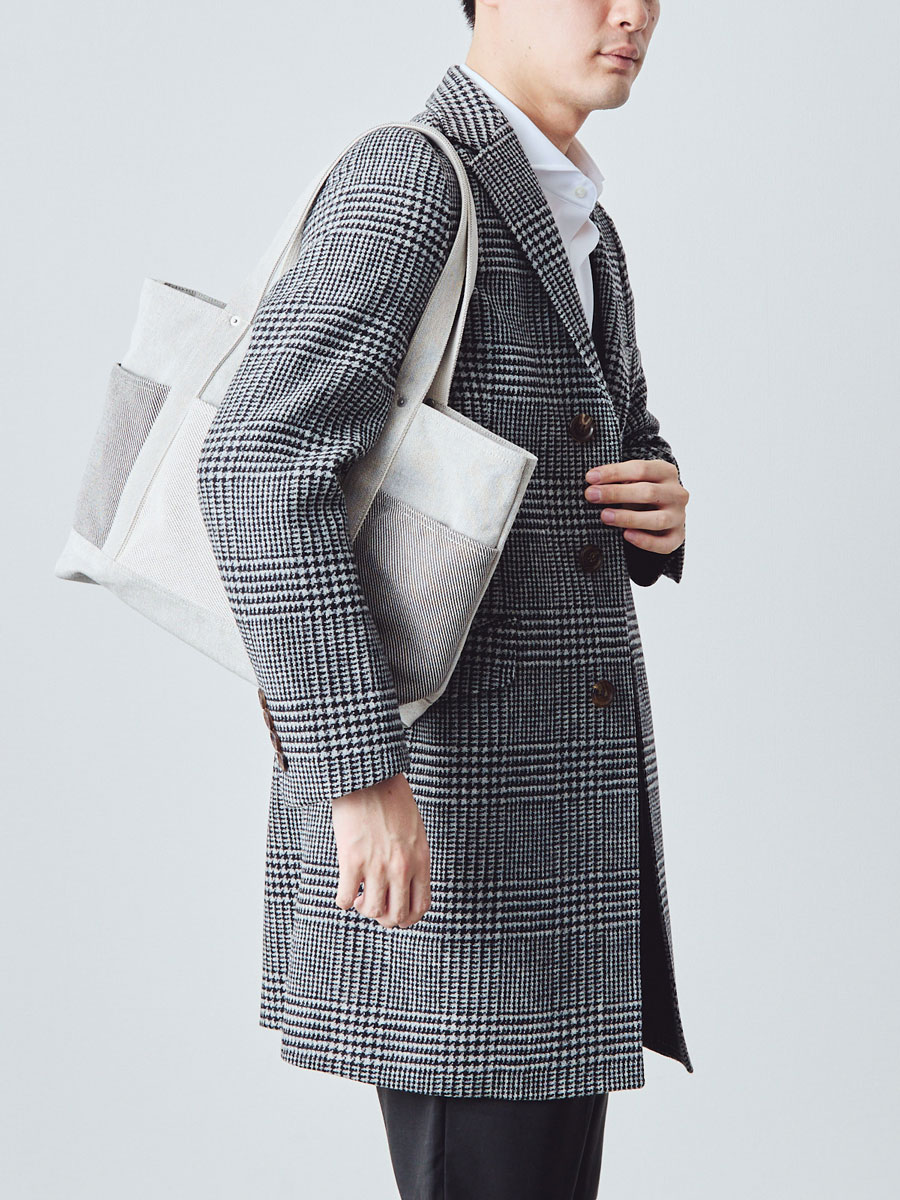 カジュアルなイメージの帆布トートですが、きれいめスタイルにもよく合います。
