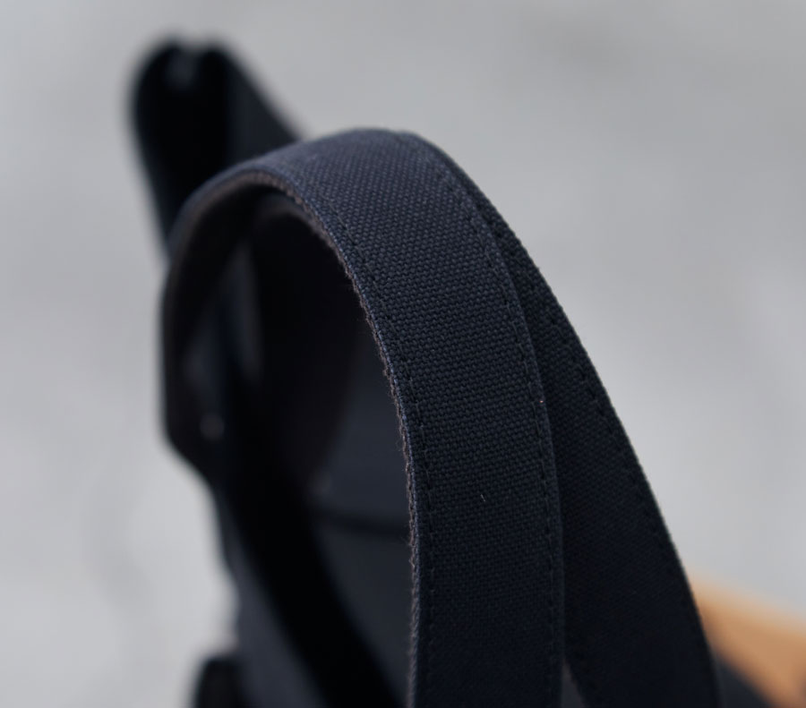 帆布の適度な摩擦によって、肩からかけたときにも持ち手がずれ落ちにくく、手で握って持った場合でも、手に馴染む感覚。