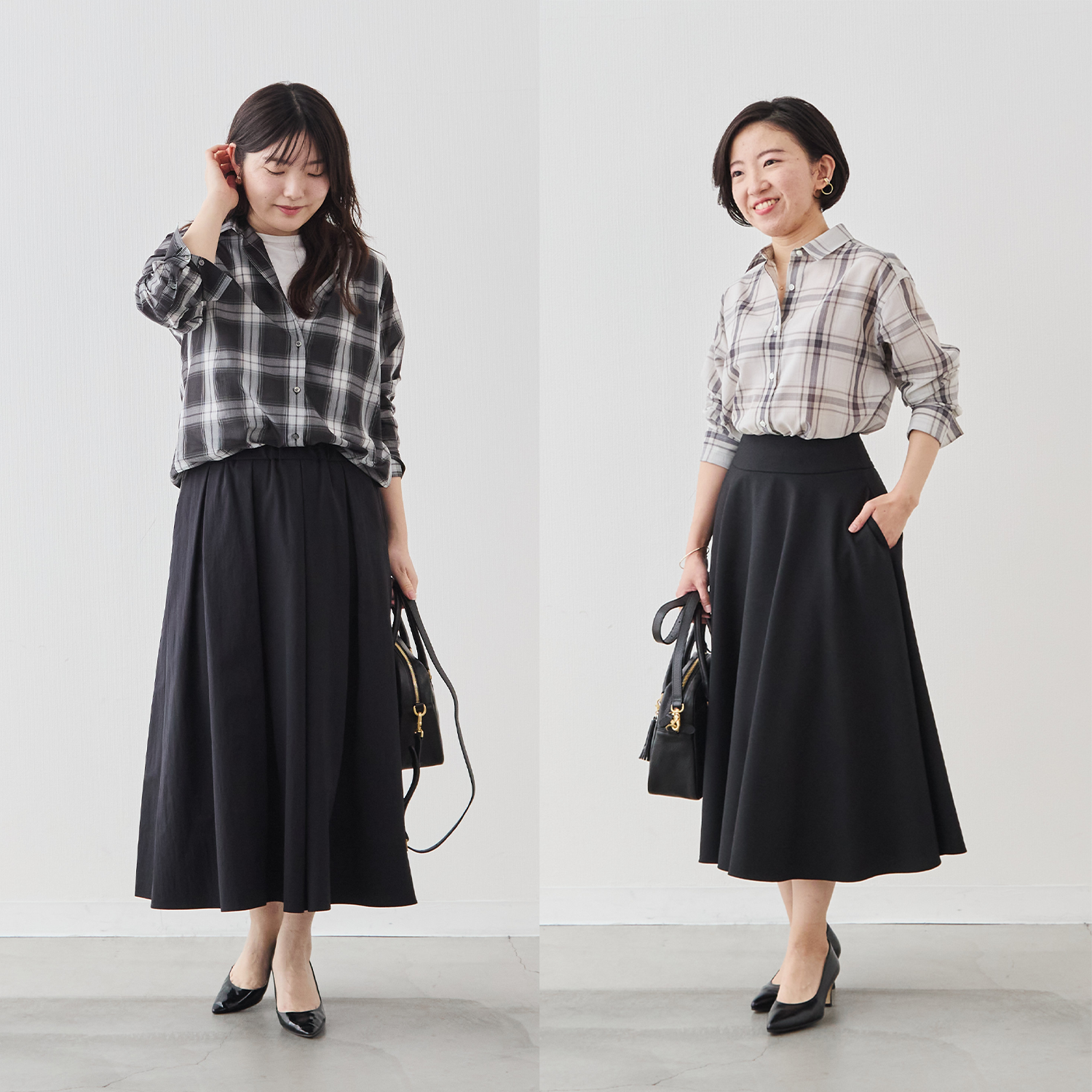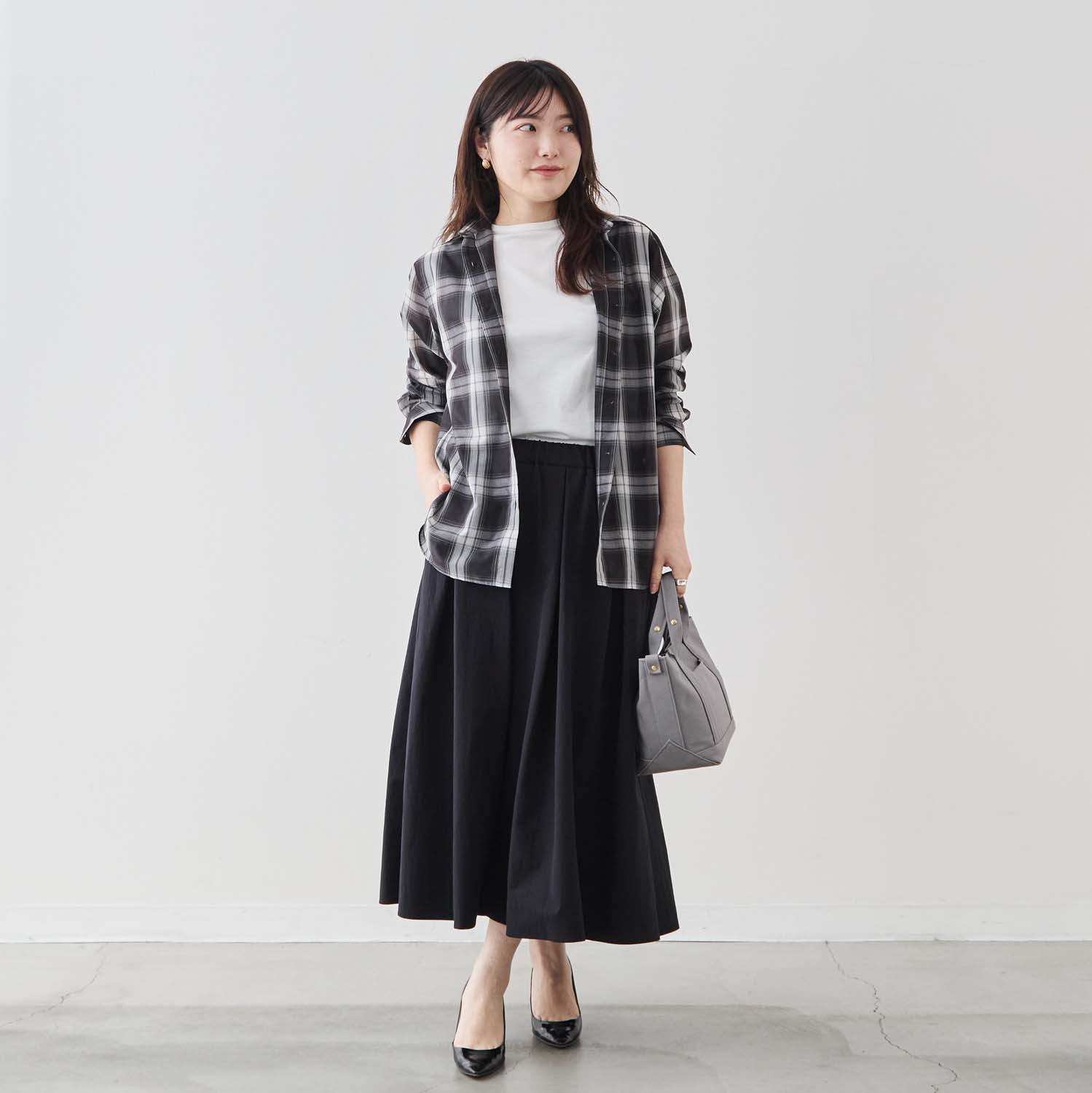 チェックは縦のラインが強調されるため視覚的にすっきり見えやすく、着痩せ効果も期待できますよ!