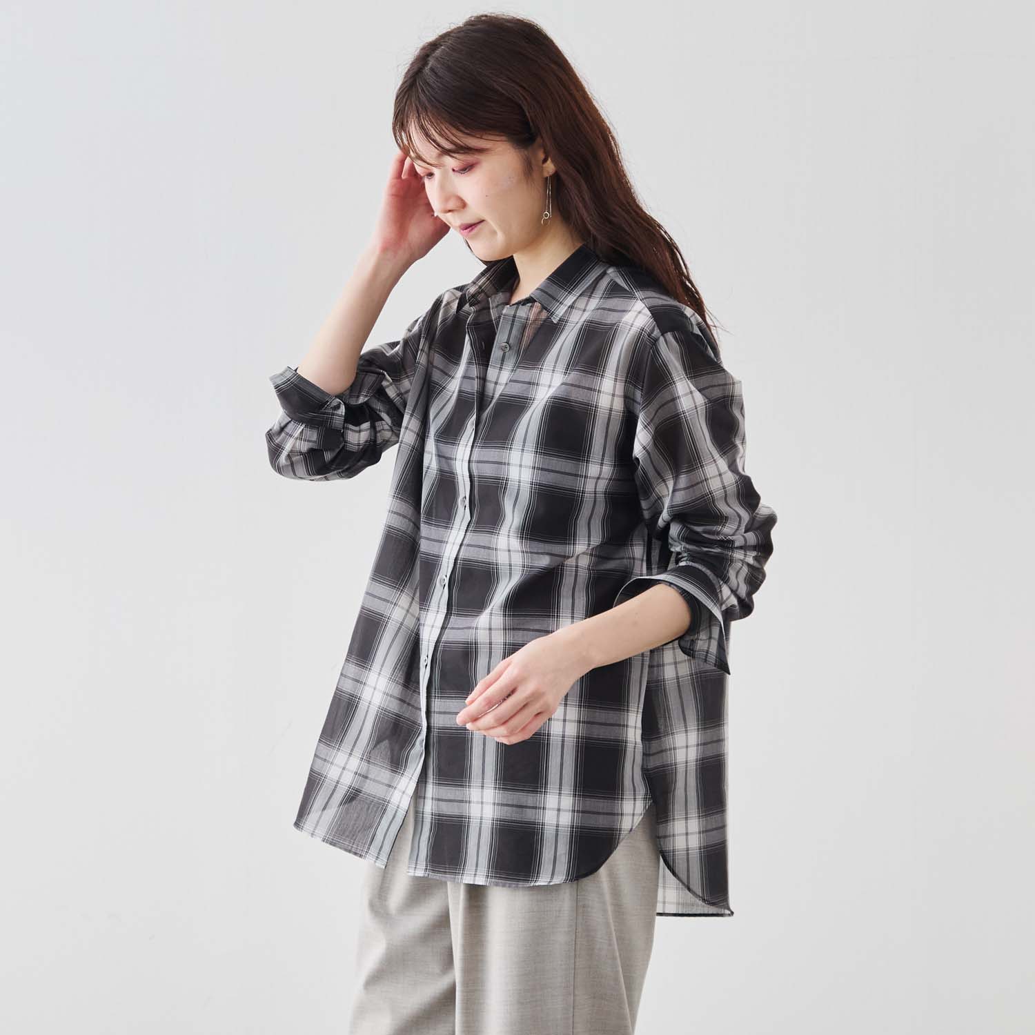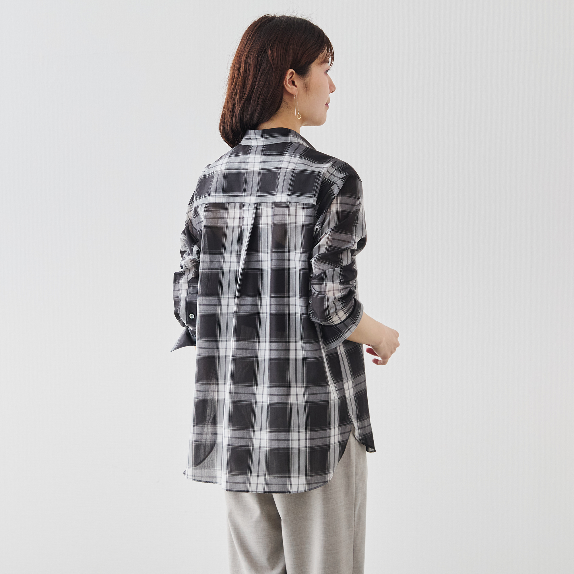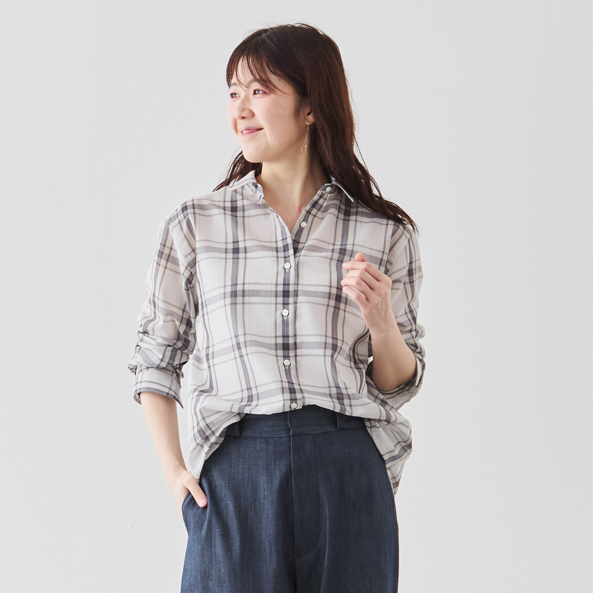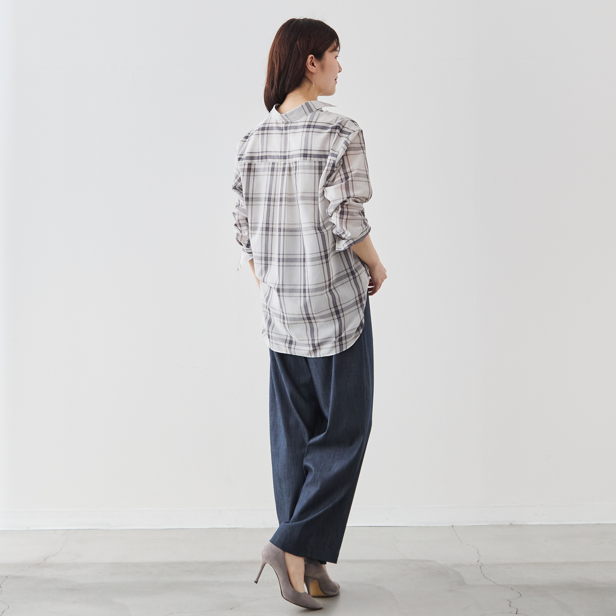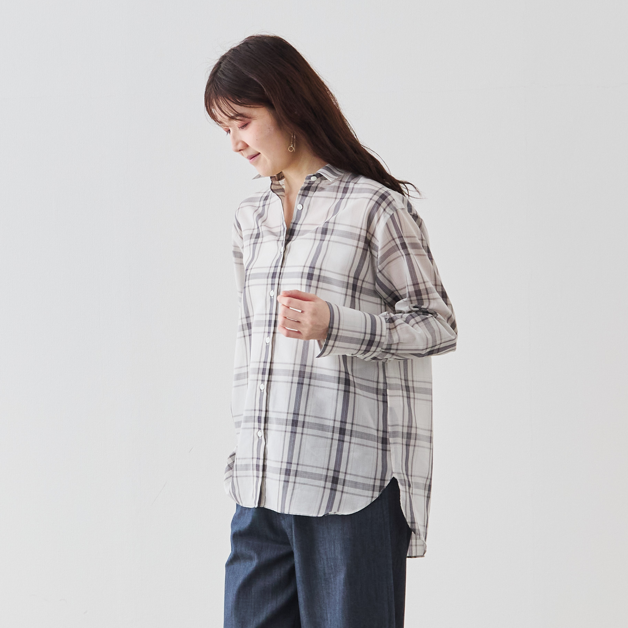 カジュアルなチェックシャツでありながら、凛とした佇まいが生まれます。