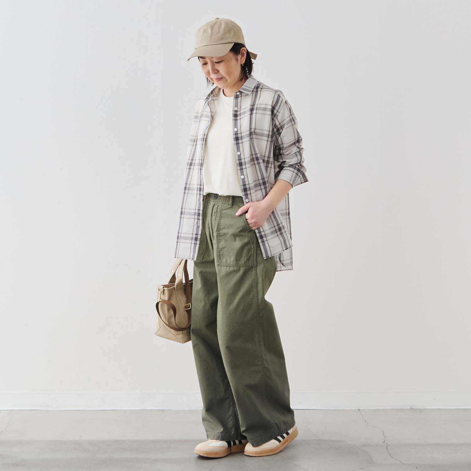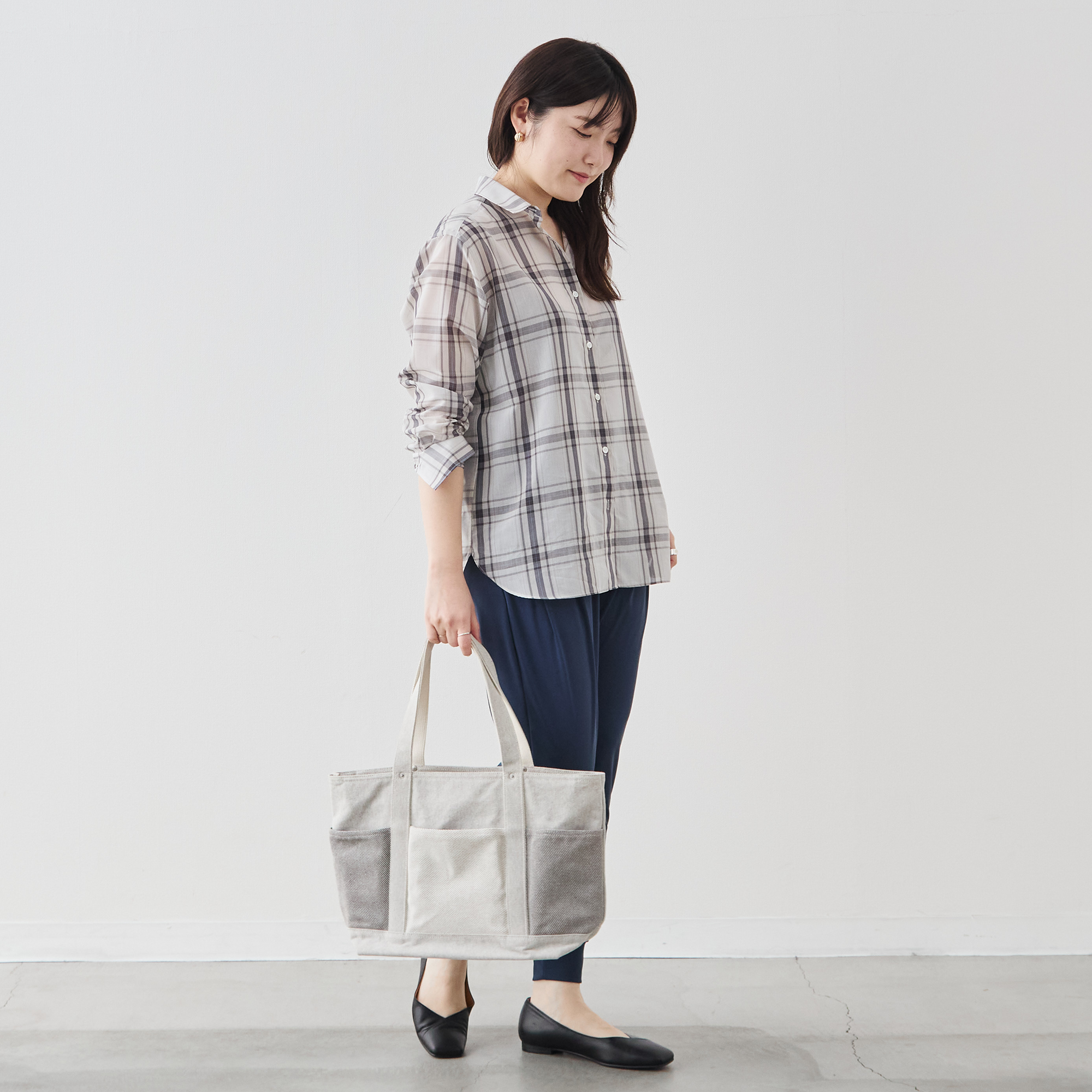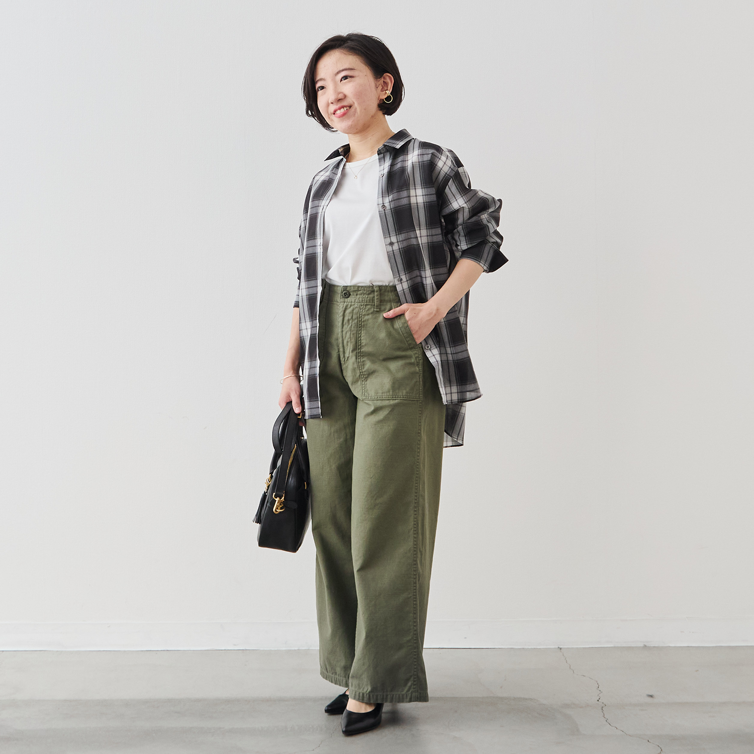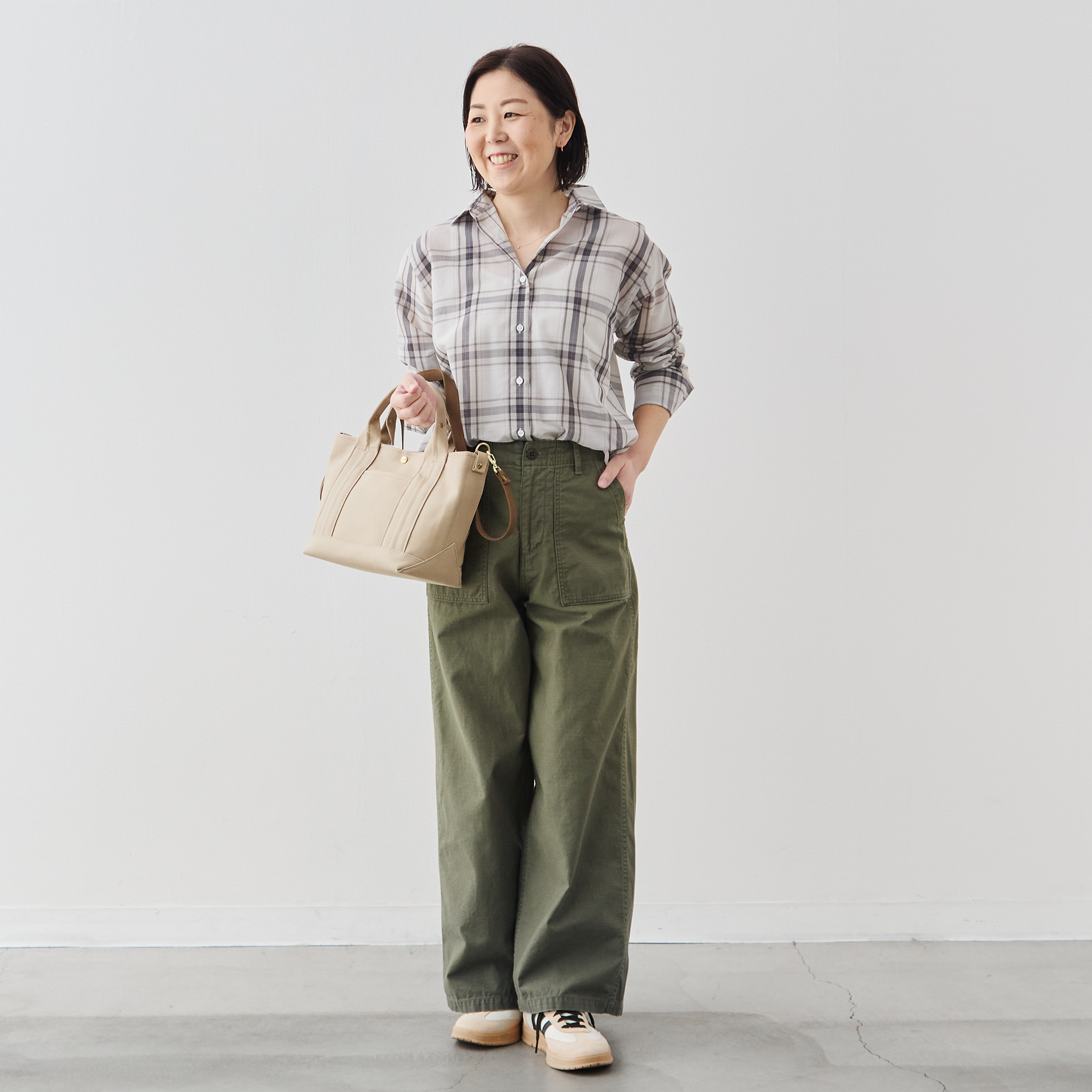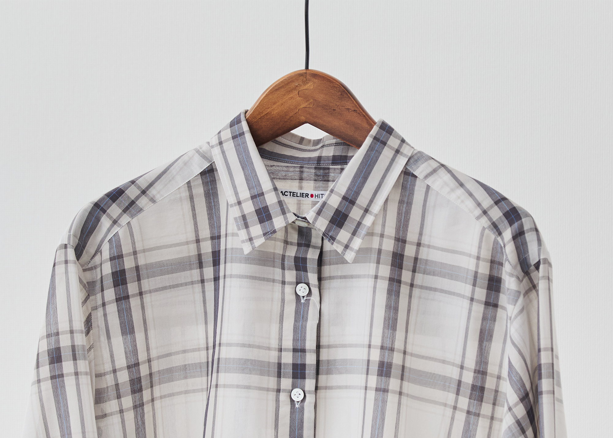 カジュアルなチェックシャツでありながら、凛とした佇まいが生まれます。