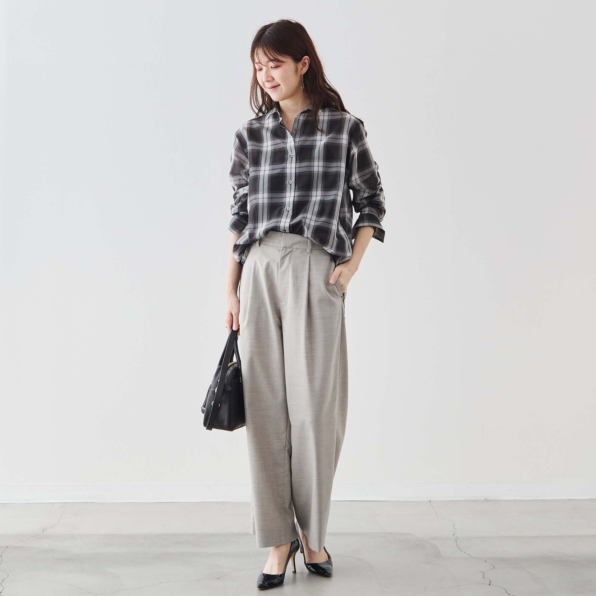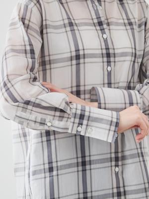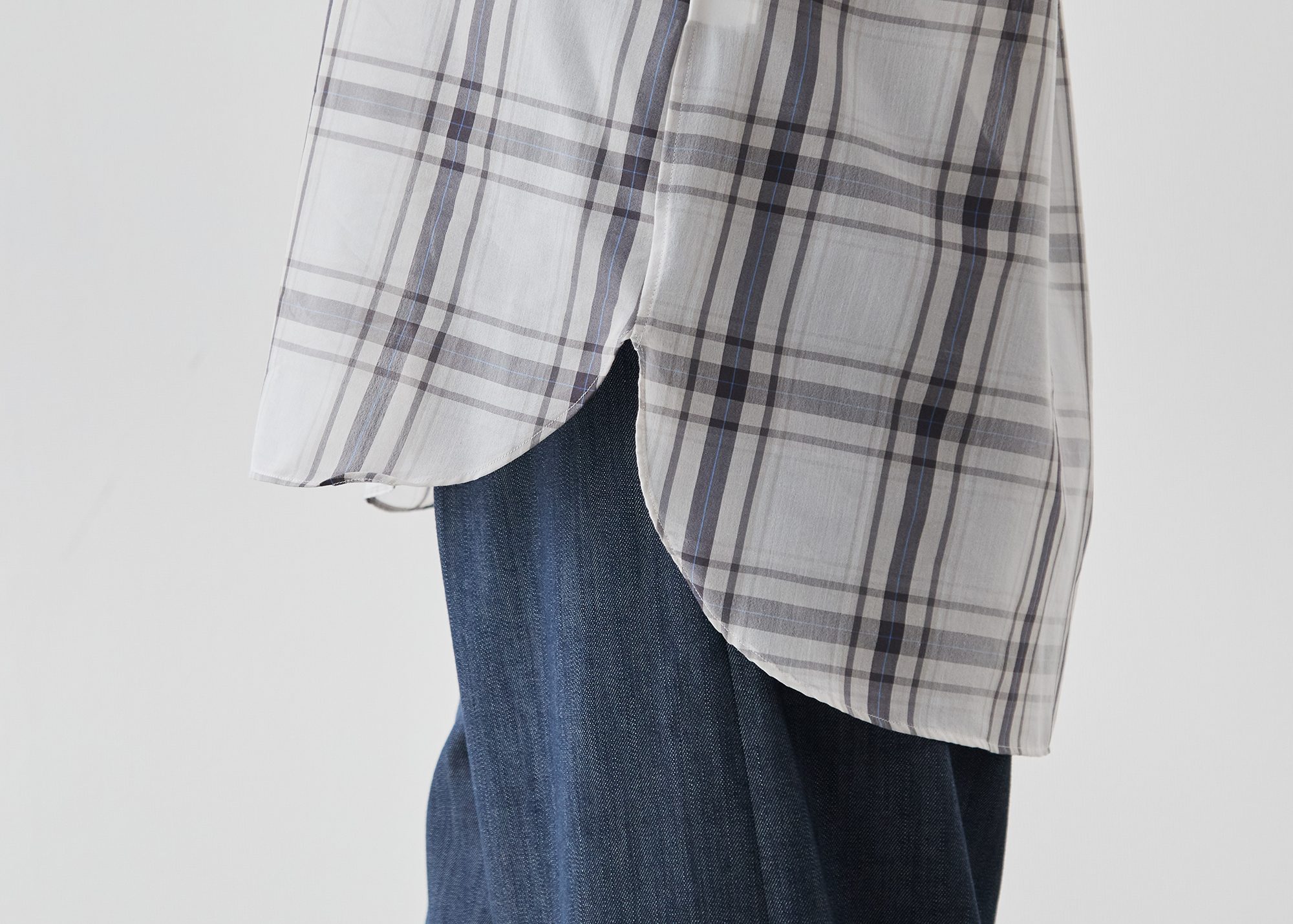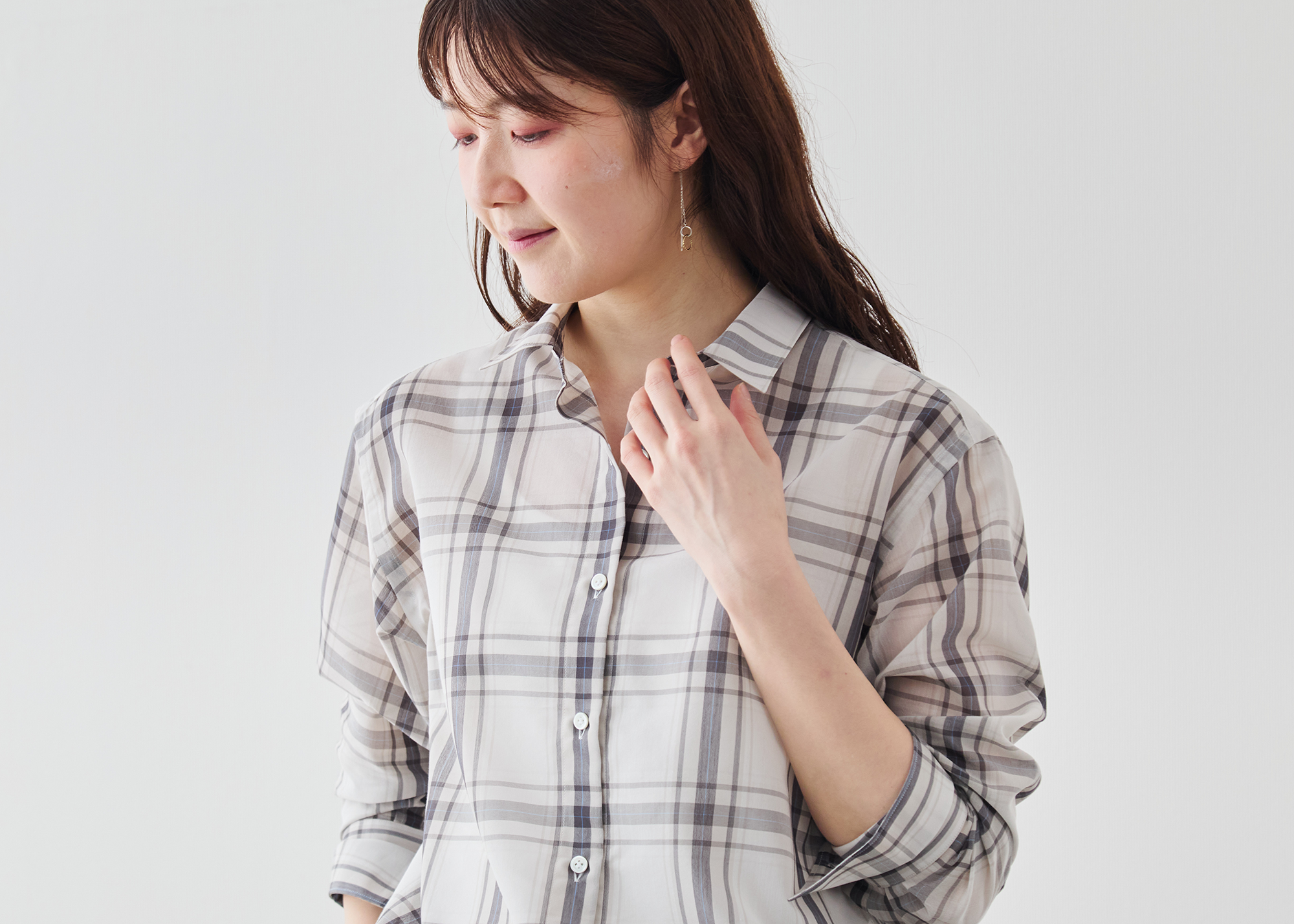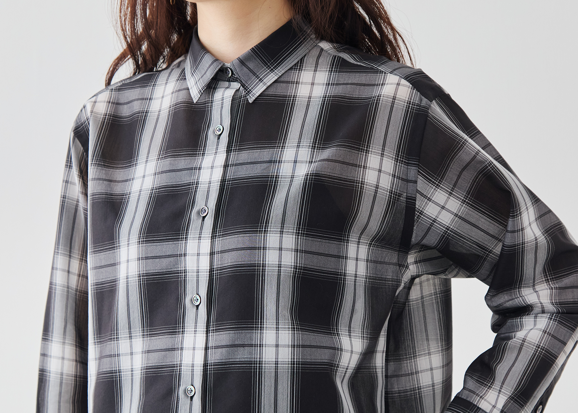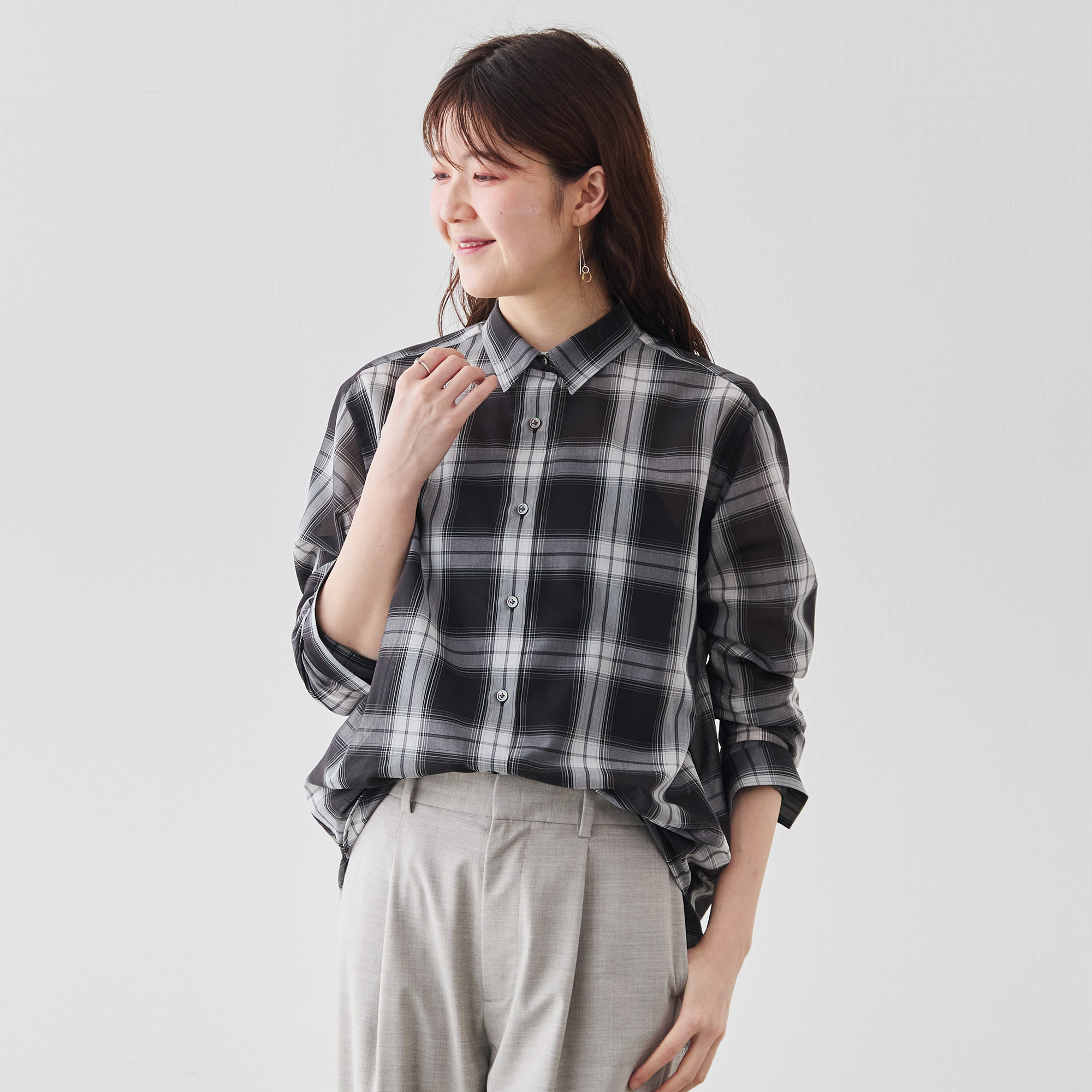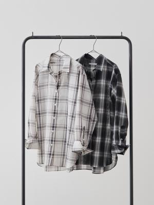 大柄チェックの存在感と、控えめなシアーの上品さ。