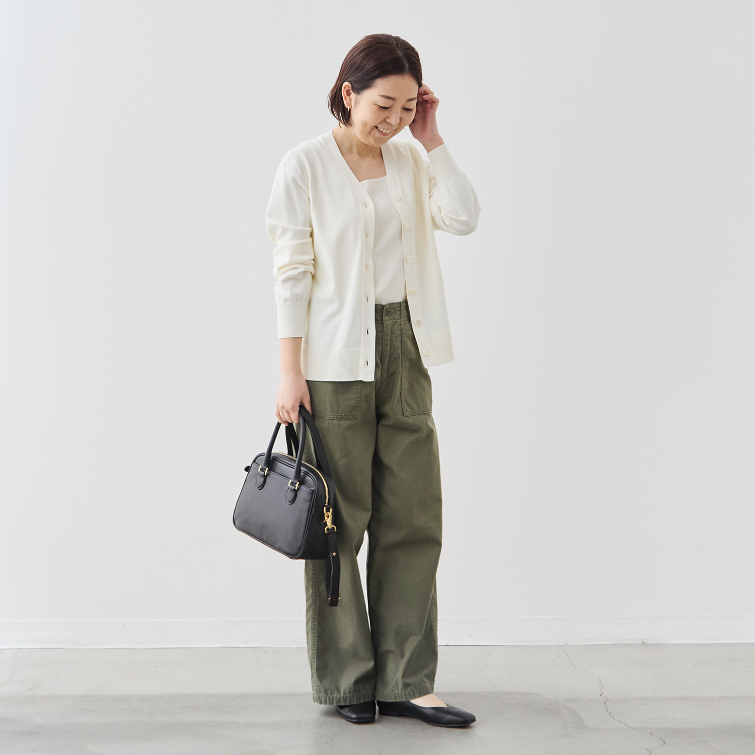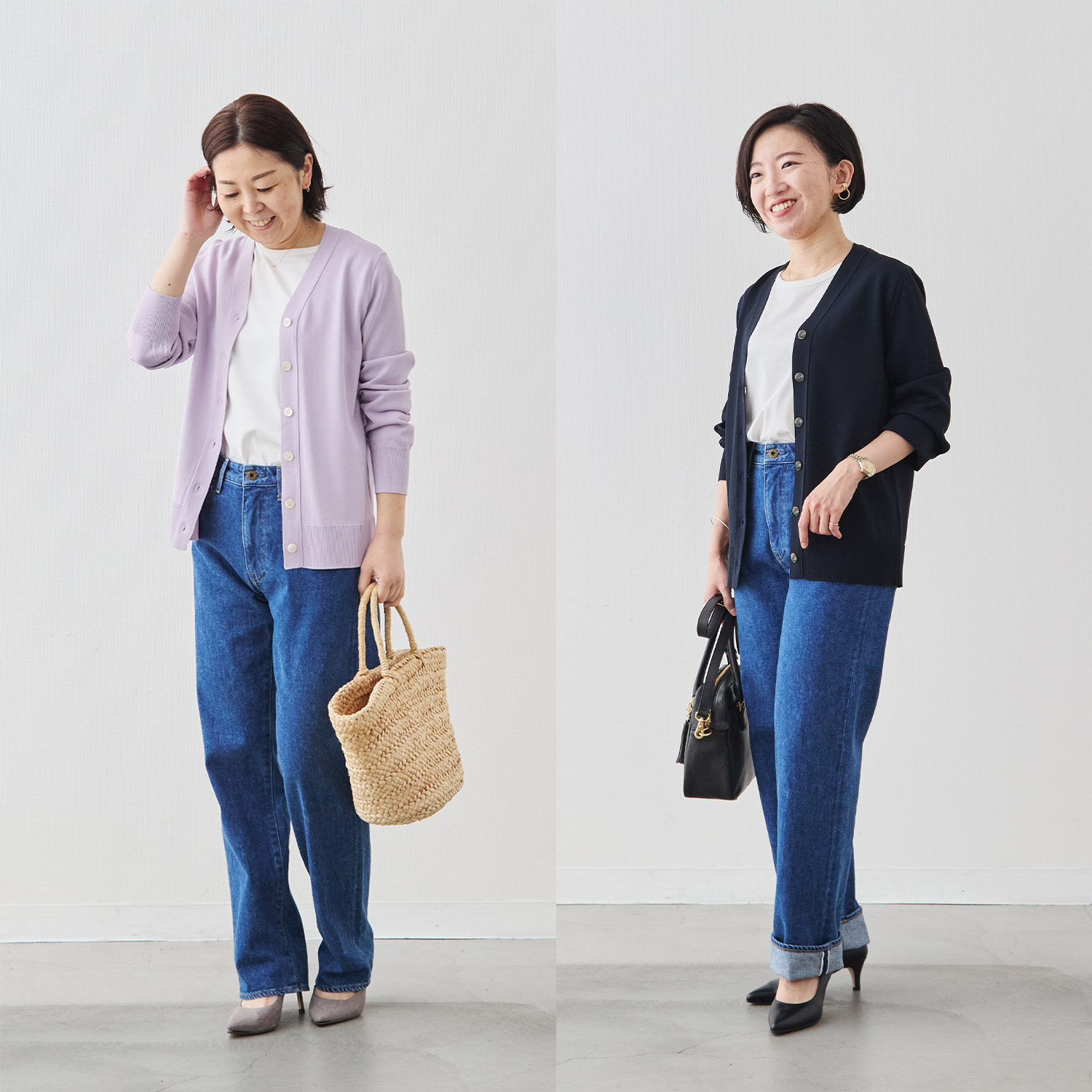 カーディガン自体に品があるため、カジュアルなアイテムと合わせても上品さを損ないません。