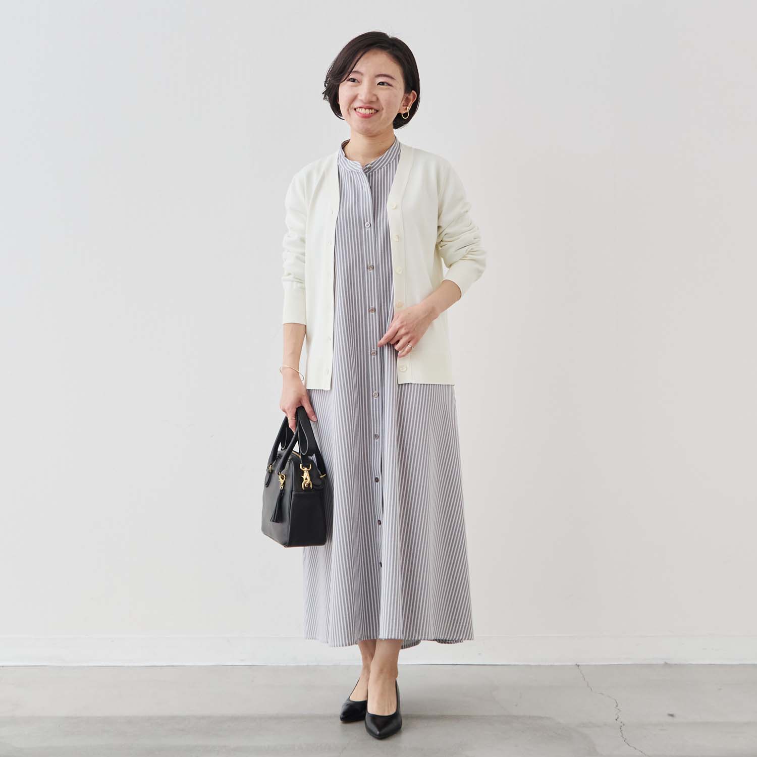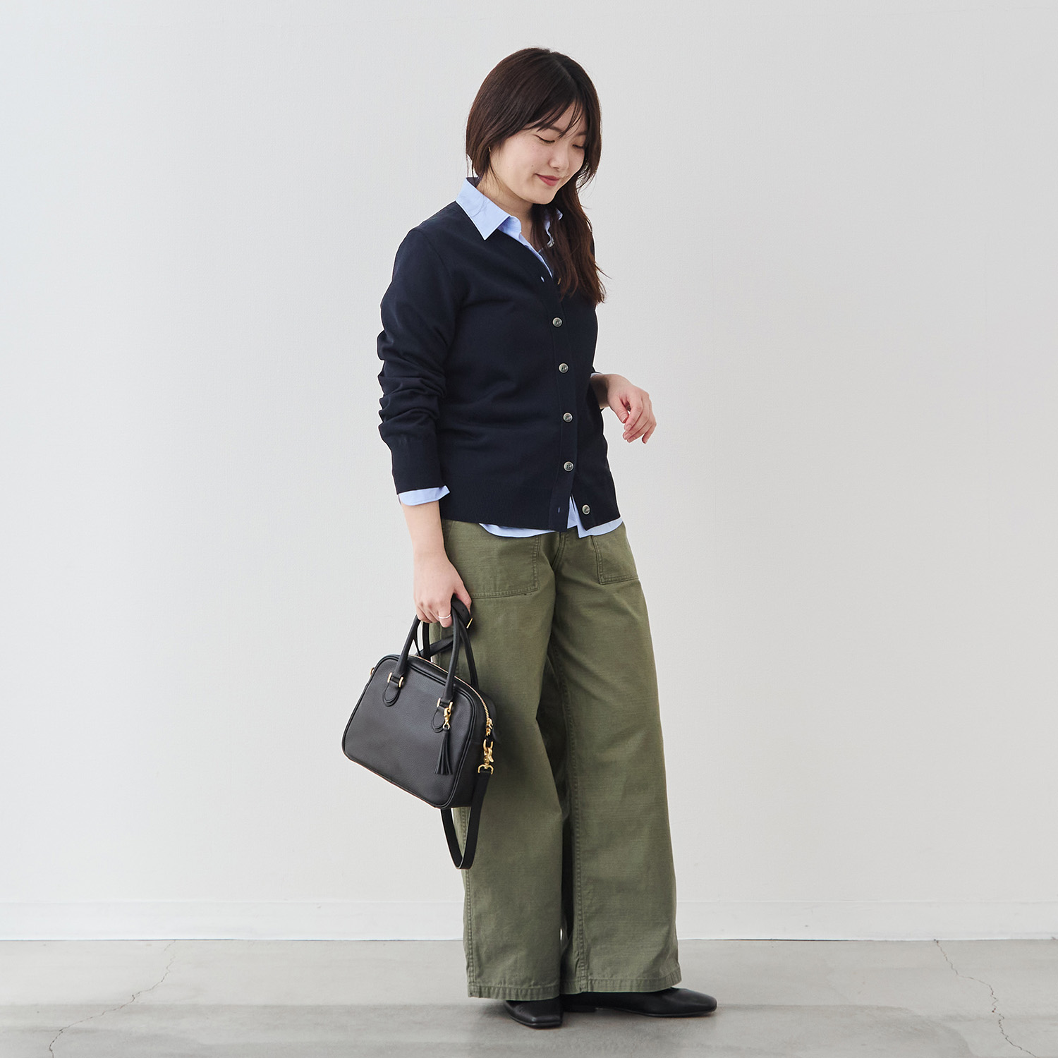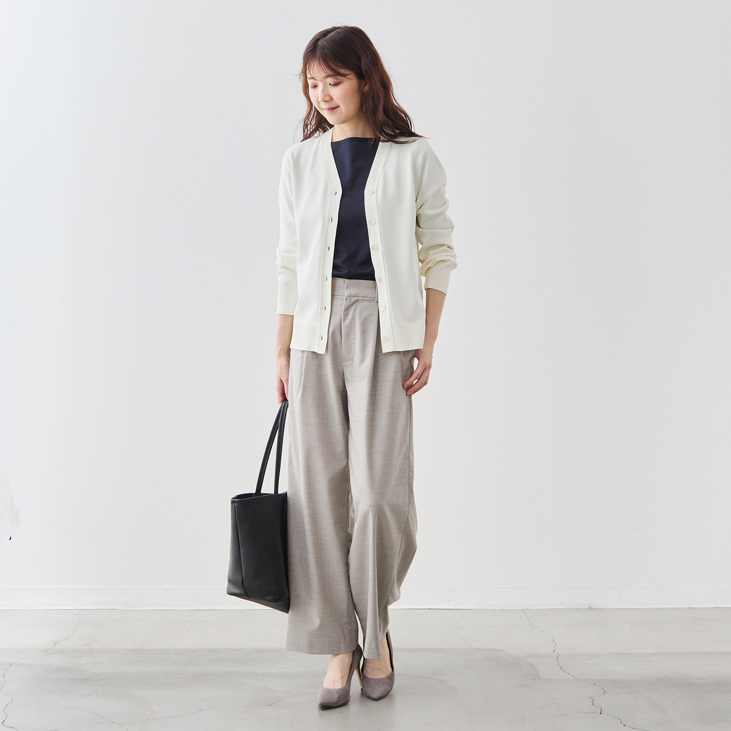 シャツやスラックスと合わせれば、お仕事シーンでも着られる、きちんと感のあるスタイルに。