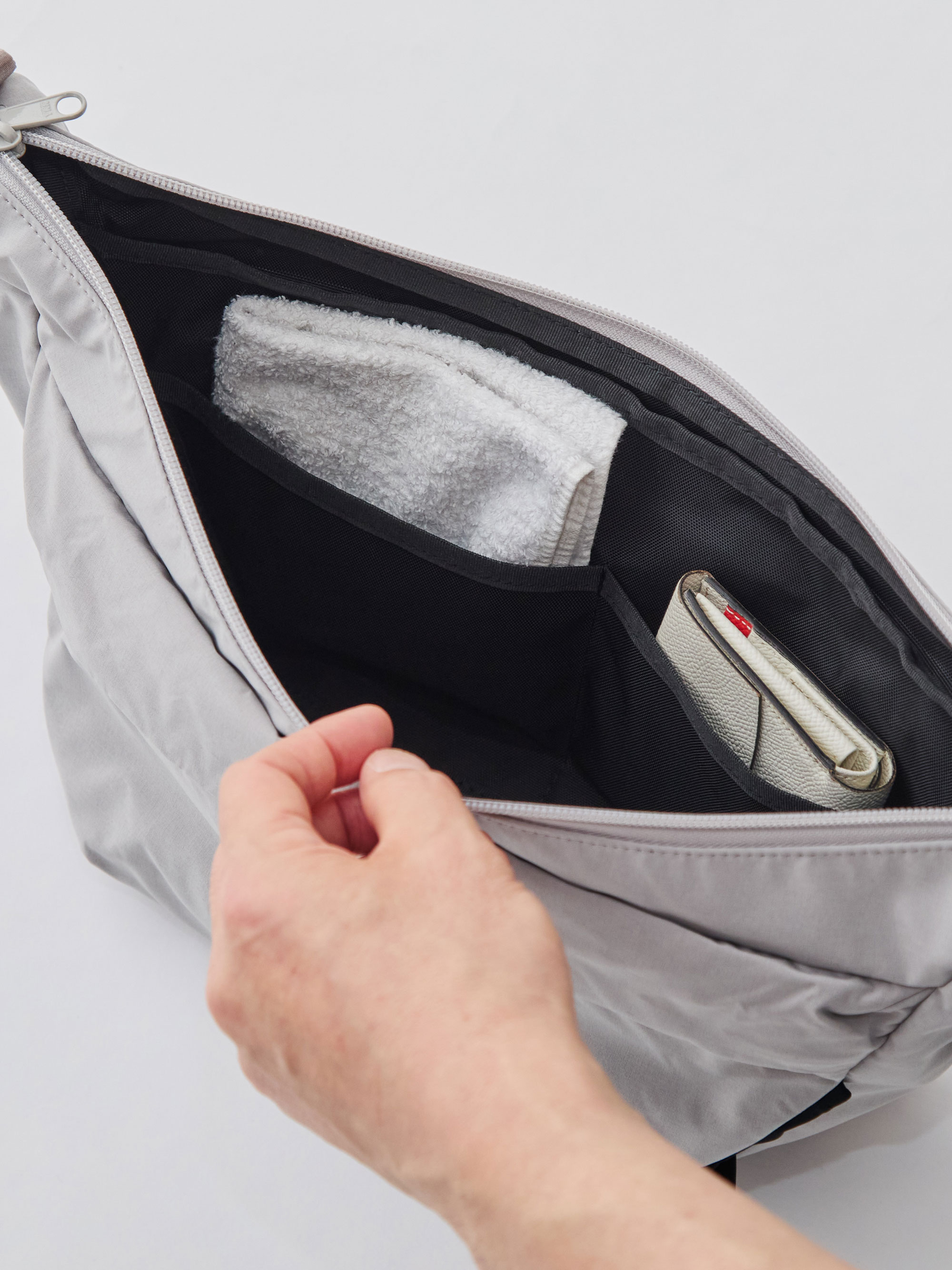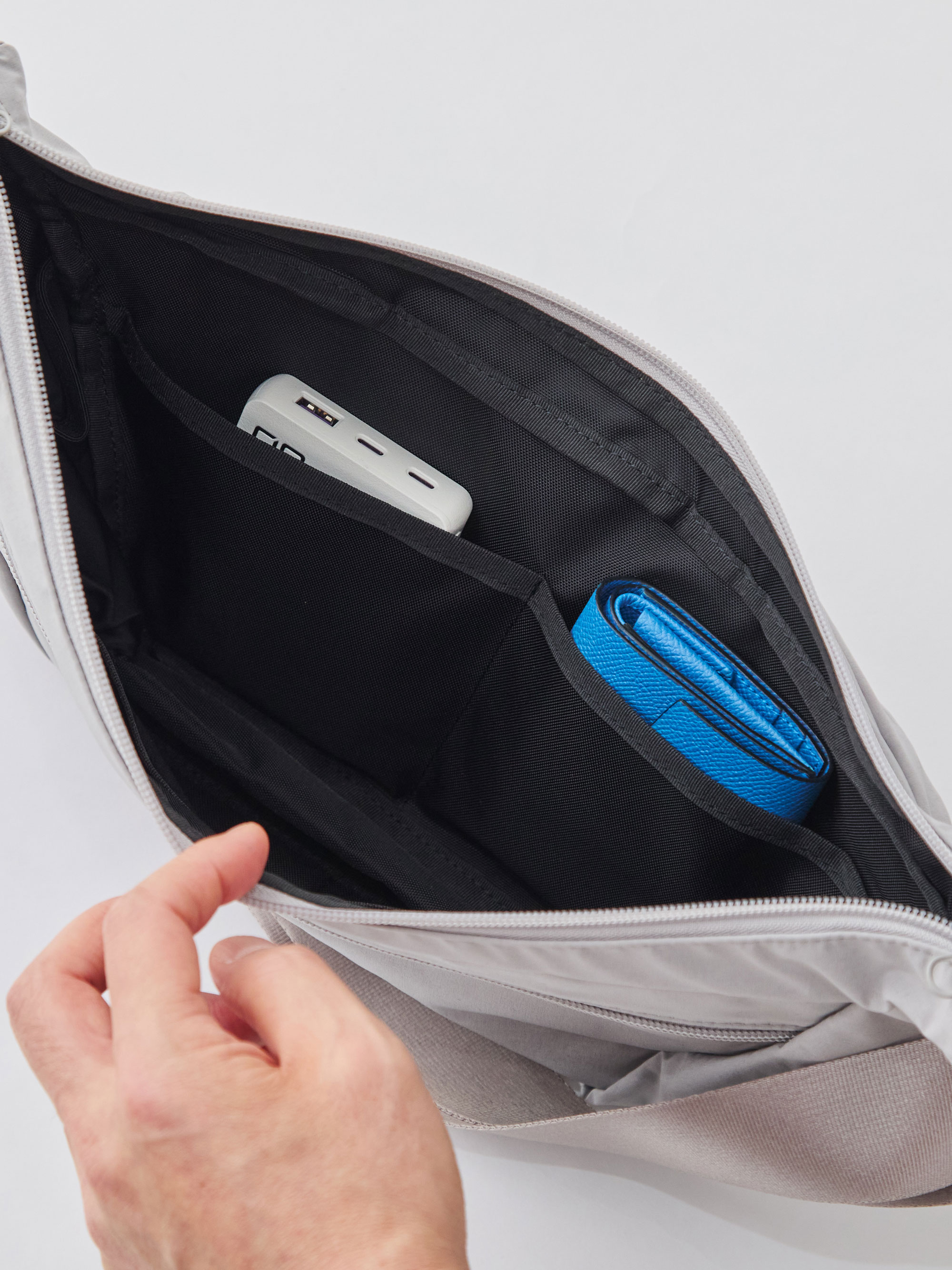 両サイドのポケットは、内部で別室に分かれた構造になっています。左右どちらからアクセスしても荷物が干渉しない、細かな設計のこだわりです。