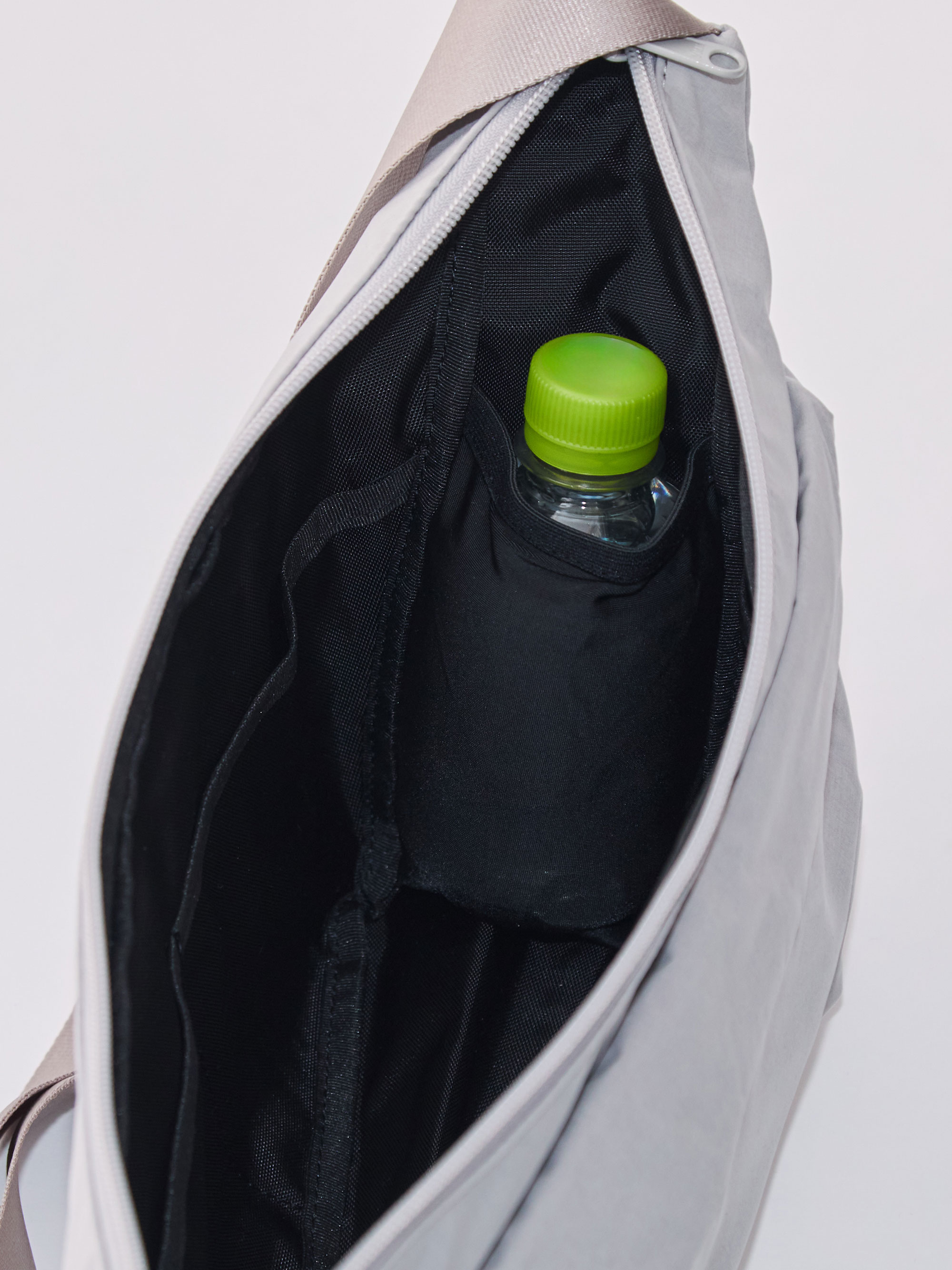 また、ペットボトルホルダーとしても機能する内側のスペースにも同じ素材を採用。結露で水滴がついたペットボトルも、気兼ねなく収納できます。